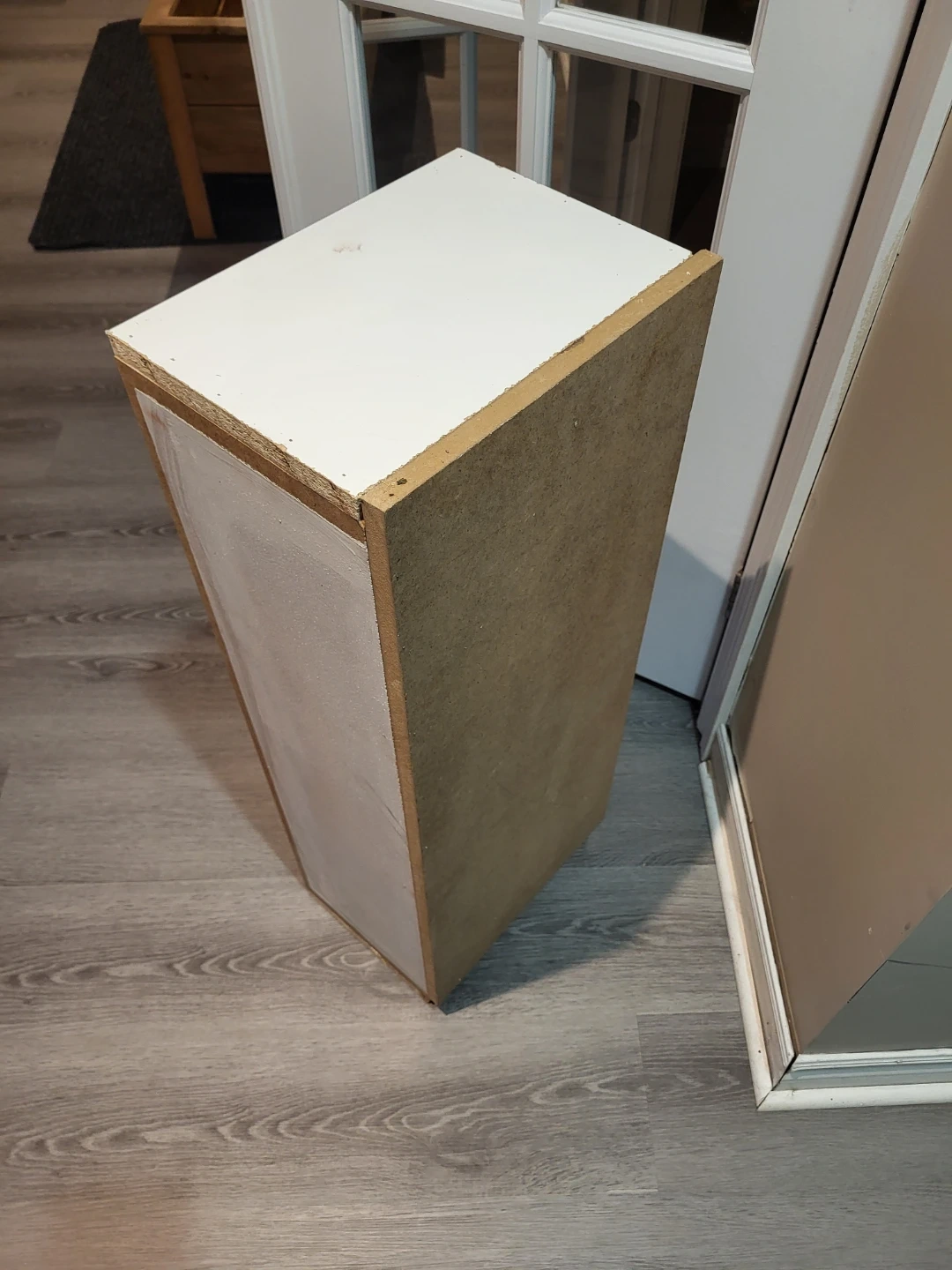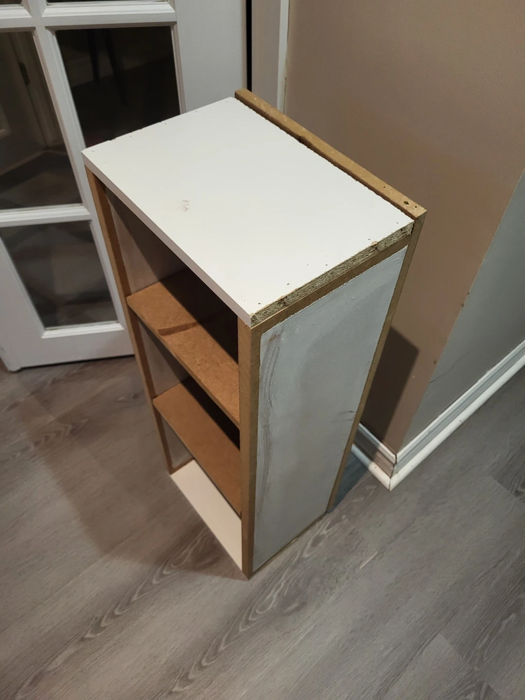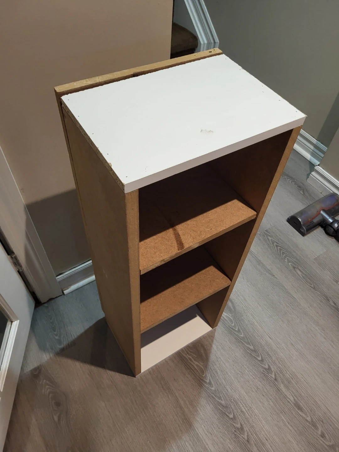 193Selling a small shelf unit, perfect for tight spaces! It's white on top and the sides are a light brown colour. It measures about 32 inches tall and 9 inches wide.