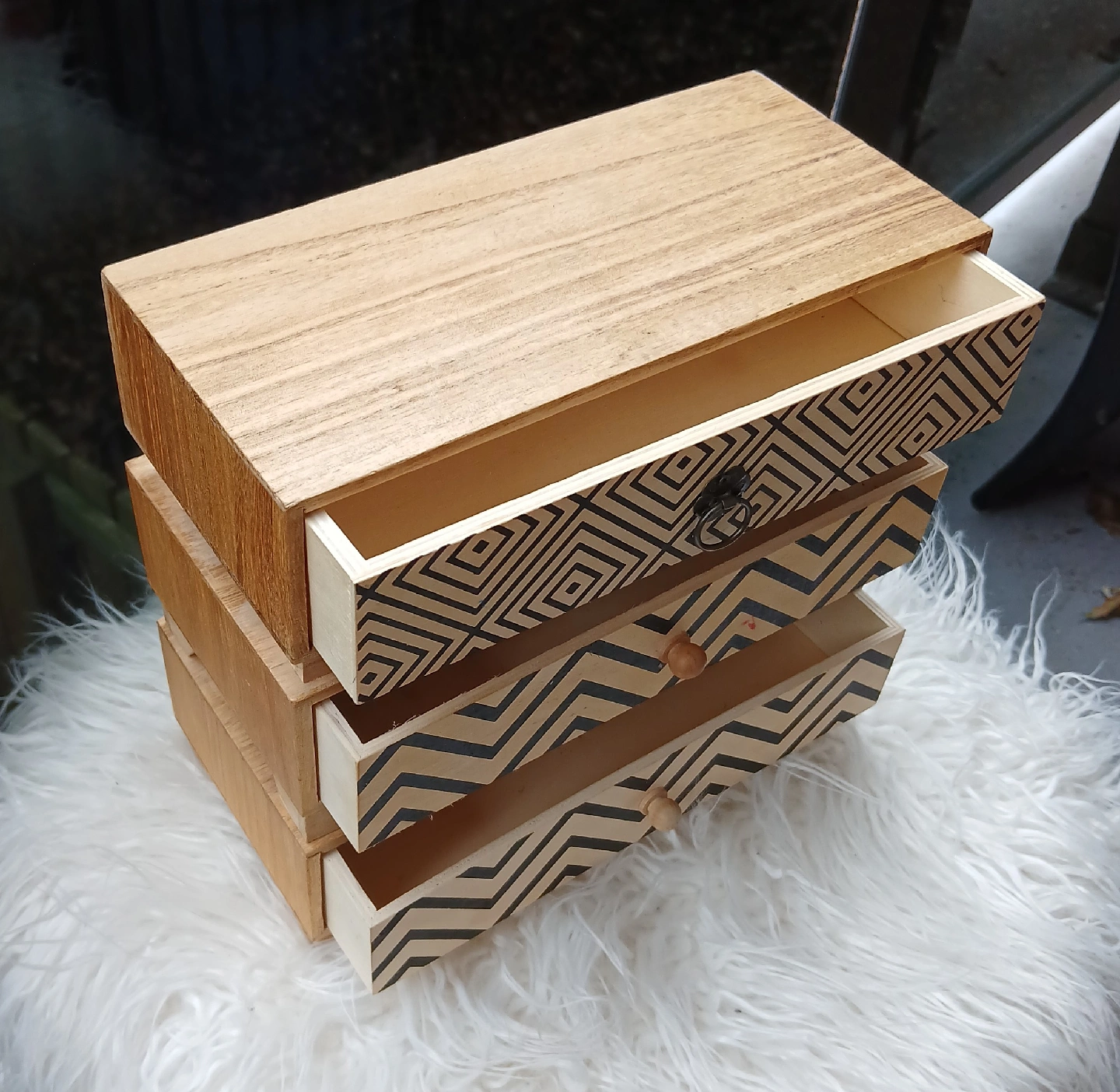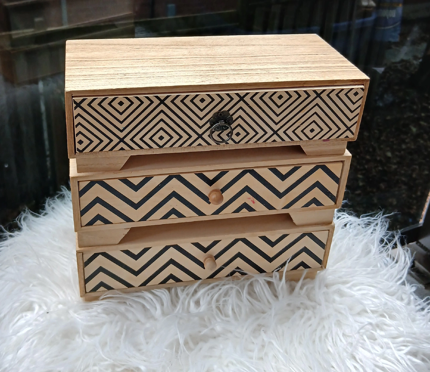 Here's a cute wooden storage unit with three drawers. It's perfect for organizing small items and adding a touch of style to any room. The drawers have different geometric patterns, which adds a unique touch 10/6/10 inches
