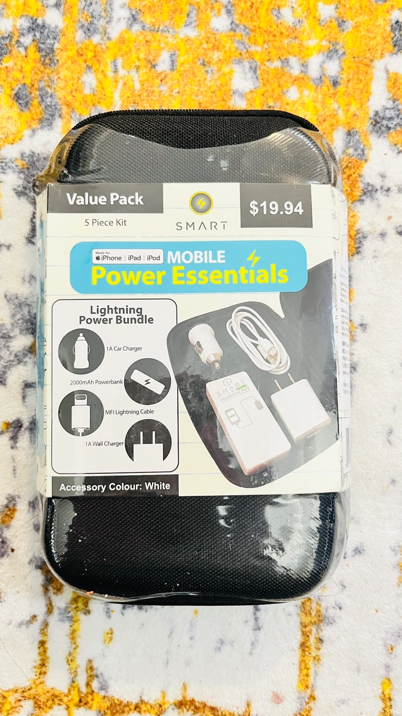 Five-piece kit includes powerbank, car charger, wall charger, and lightning cable. White accessories. New in packaging.