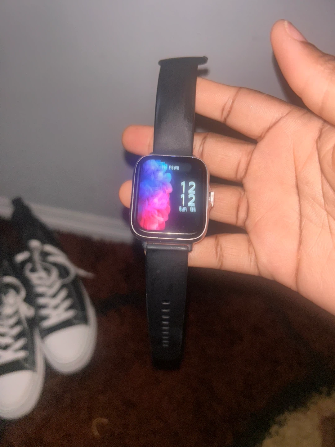 10Selling a smart watch with a black band. It has a rectangular face and appears to be in good condition. Great for tracking your steps or receiving notifications! Comes with charger!!!!!!