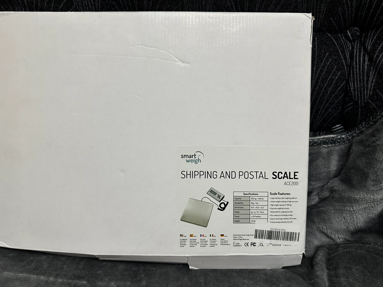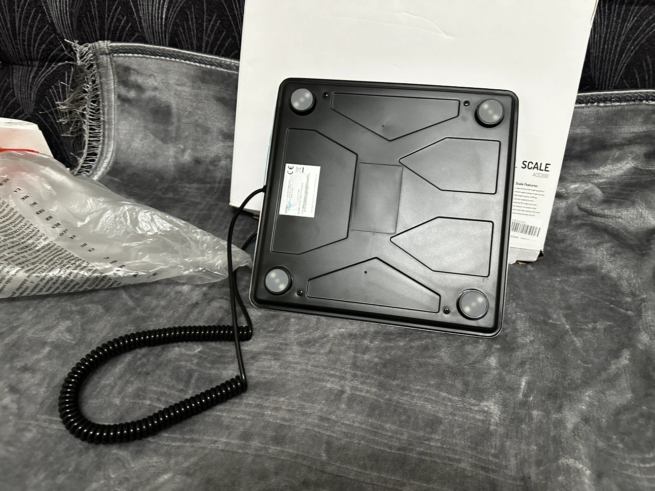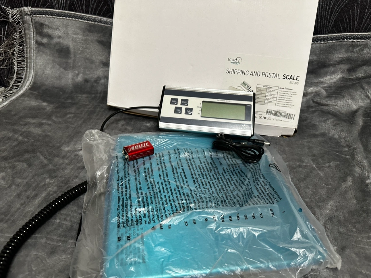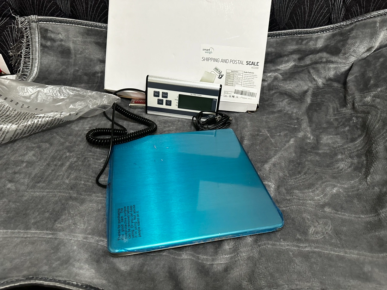 67A blue shipping and postal scale with a digital display and a black power cord. It is in the original packaging. It is a corded scale and weighs up to 150kg.