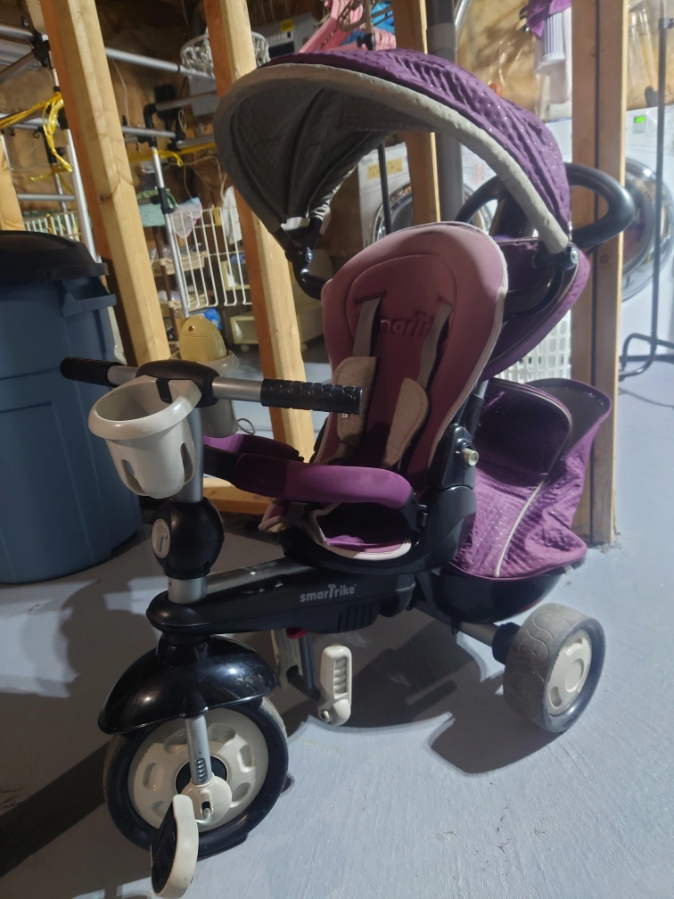 Used Smartrike tricycle. Purple and black. Features a canopy, parent handle, and storage compartment. Suitable for toddlers. Some wear and tear expected from previous use.