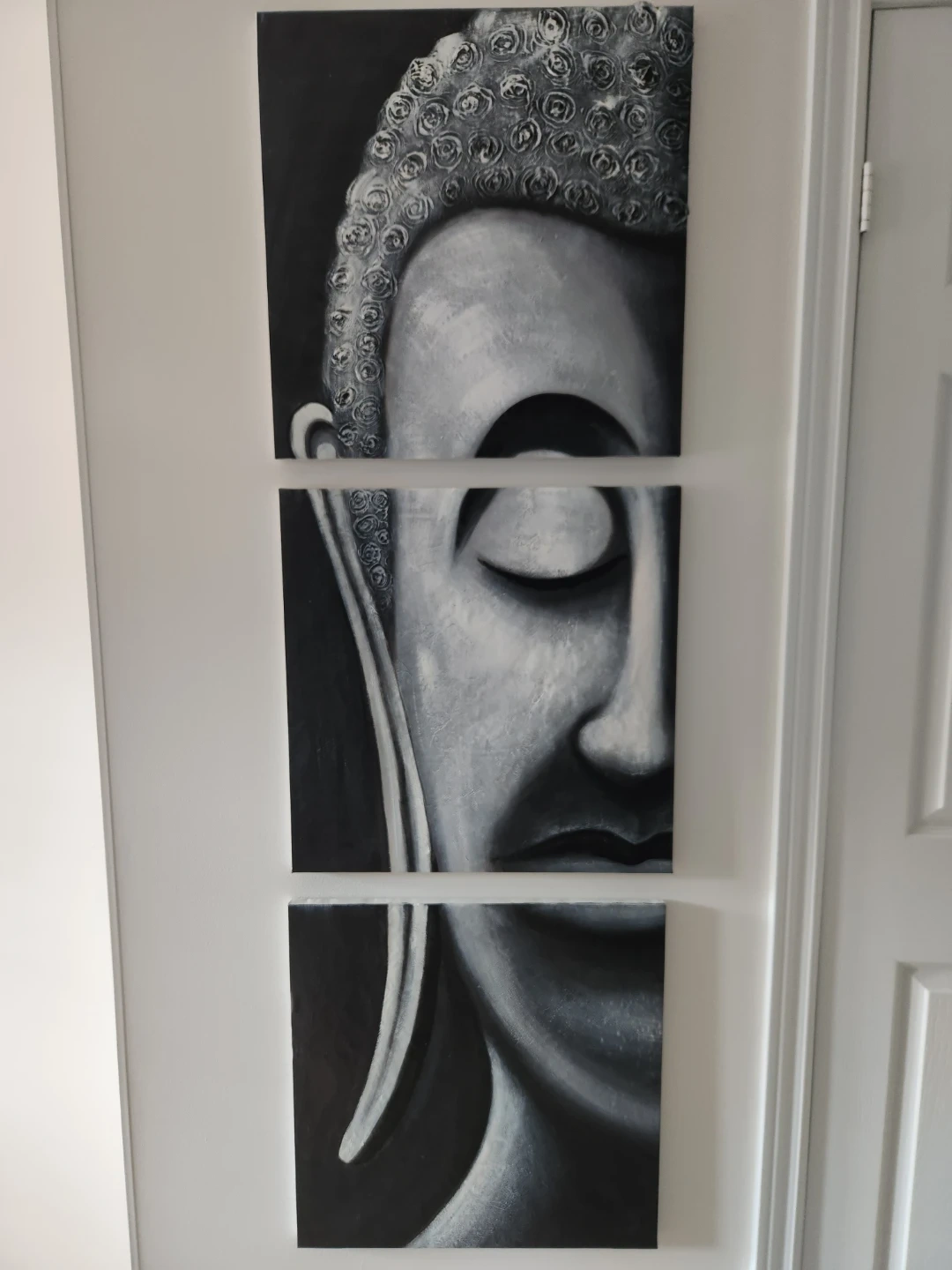 This is a three-panel canvas painting featuring a black and white depiction of Buddha's face. The textured surface adds a unique touch to the artwork. It's a striking piece that can add a serene atmosphere to any room. Each piece is 50 by 50 cm