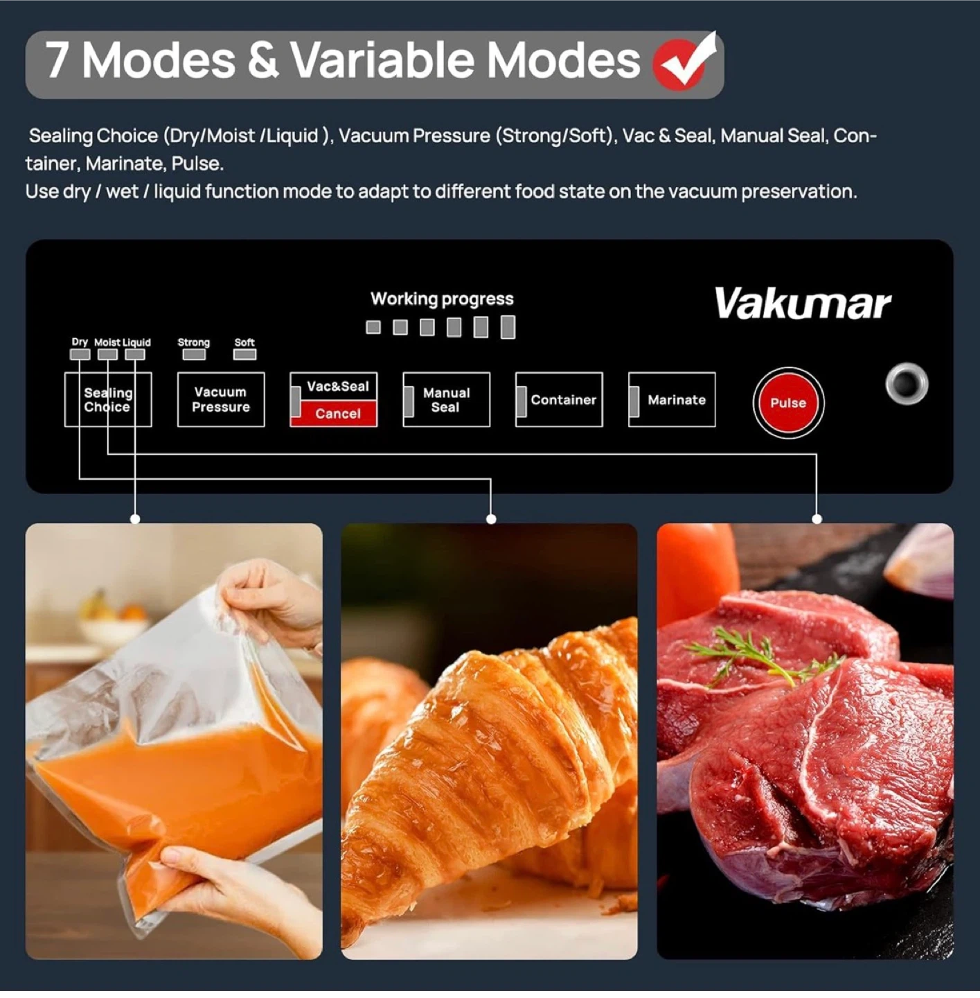 It has dedicated modes for dry, moist, and liquid foods, plus adjustable vacuum strength (strong or soft) and a pulse mode that lets you control the suction for delicate items.