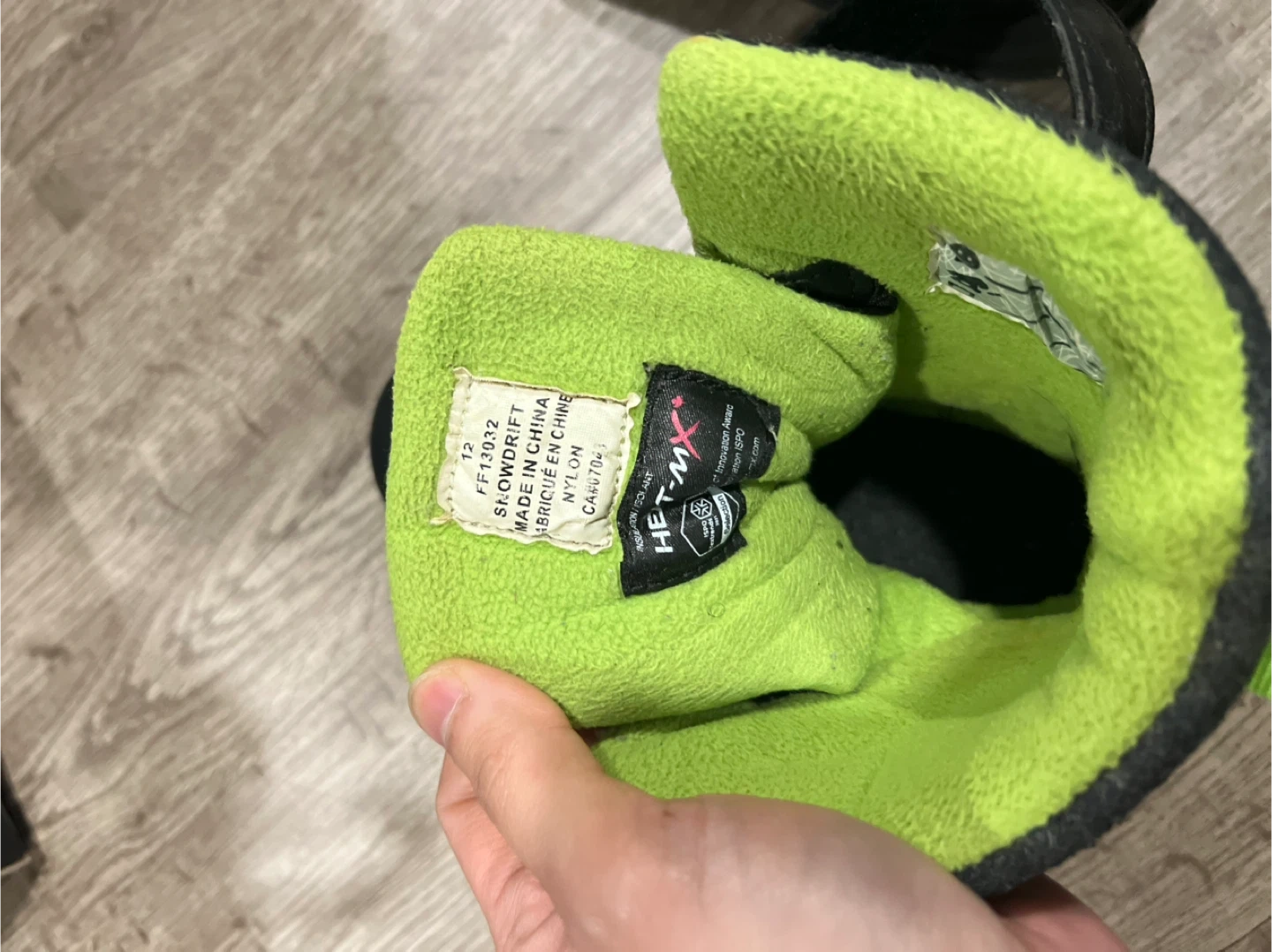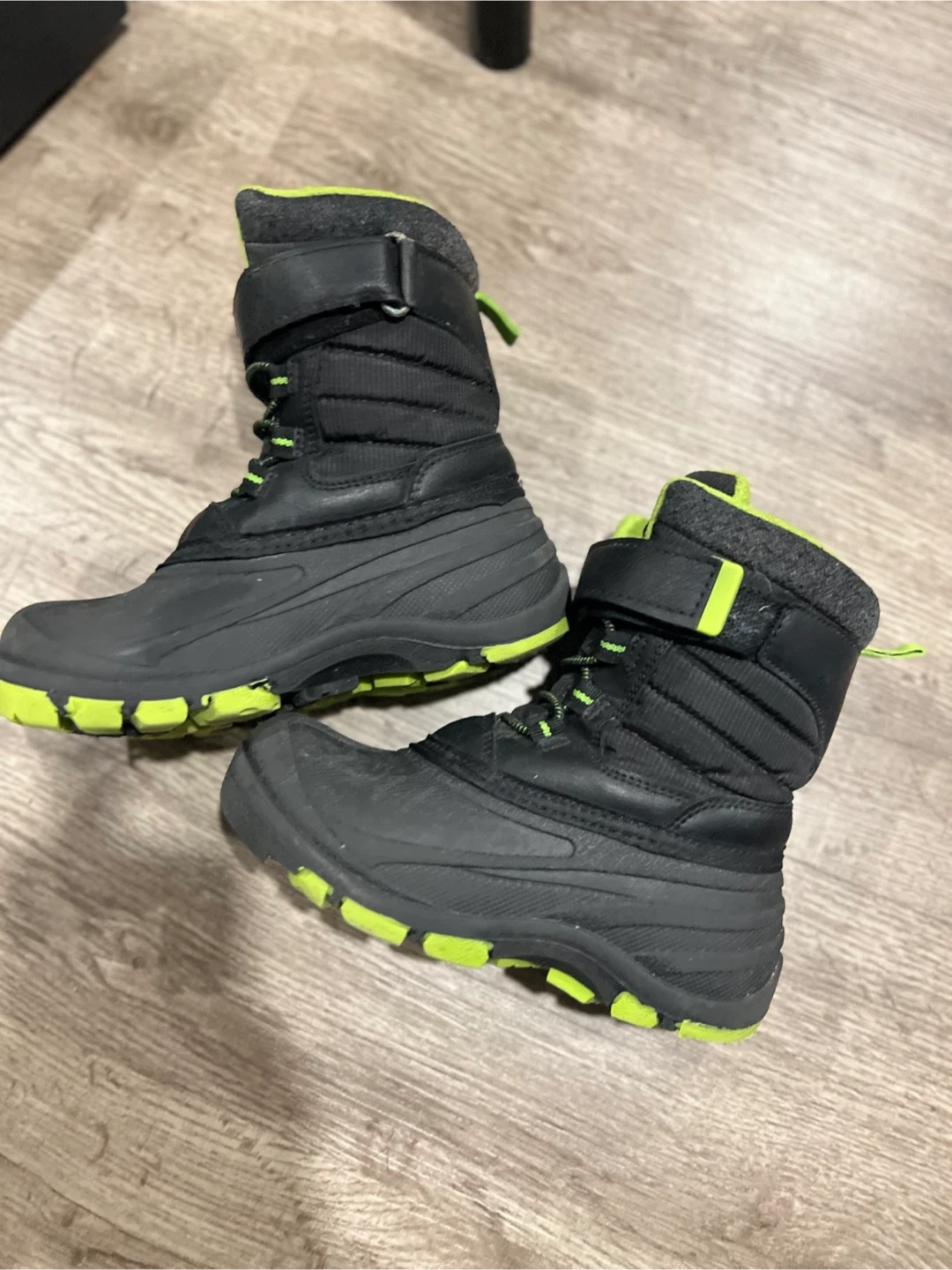 I'm selling a pair of ICE CAP kids' winter boots in size 12. They are black with neon green accents. The boots are made in China from nylon. Perfect for keeping little feet warm and dry this winter!