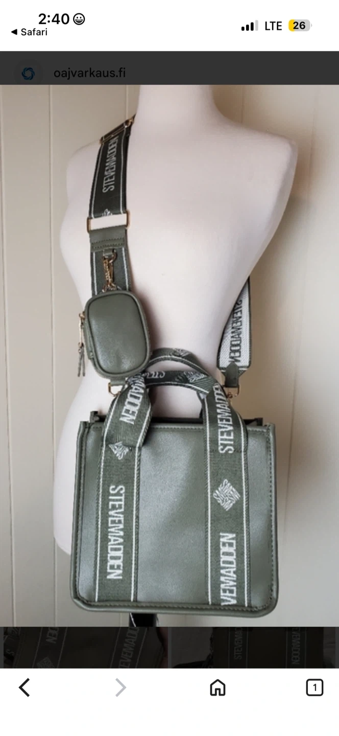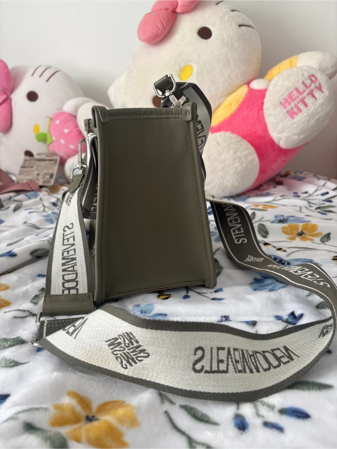 This Steve Madden mini bag comes in a stylish olive green colour and features a logo strap. It includes a detachable matching pouch for extra convenience. Perfect for carrying your essentials. Pick up cash only