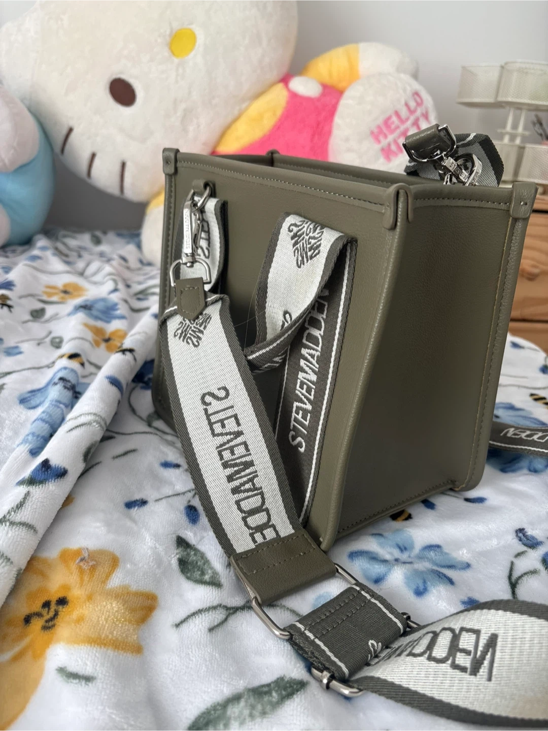 This Steve Madden mini bag comes in a stylish olive green colour and features a logo strap. It includes a detachable matching pouch for extra convenience. Perfect for carrying your essentials. Pick up cash only