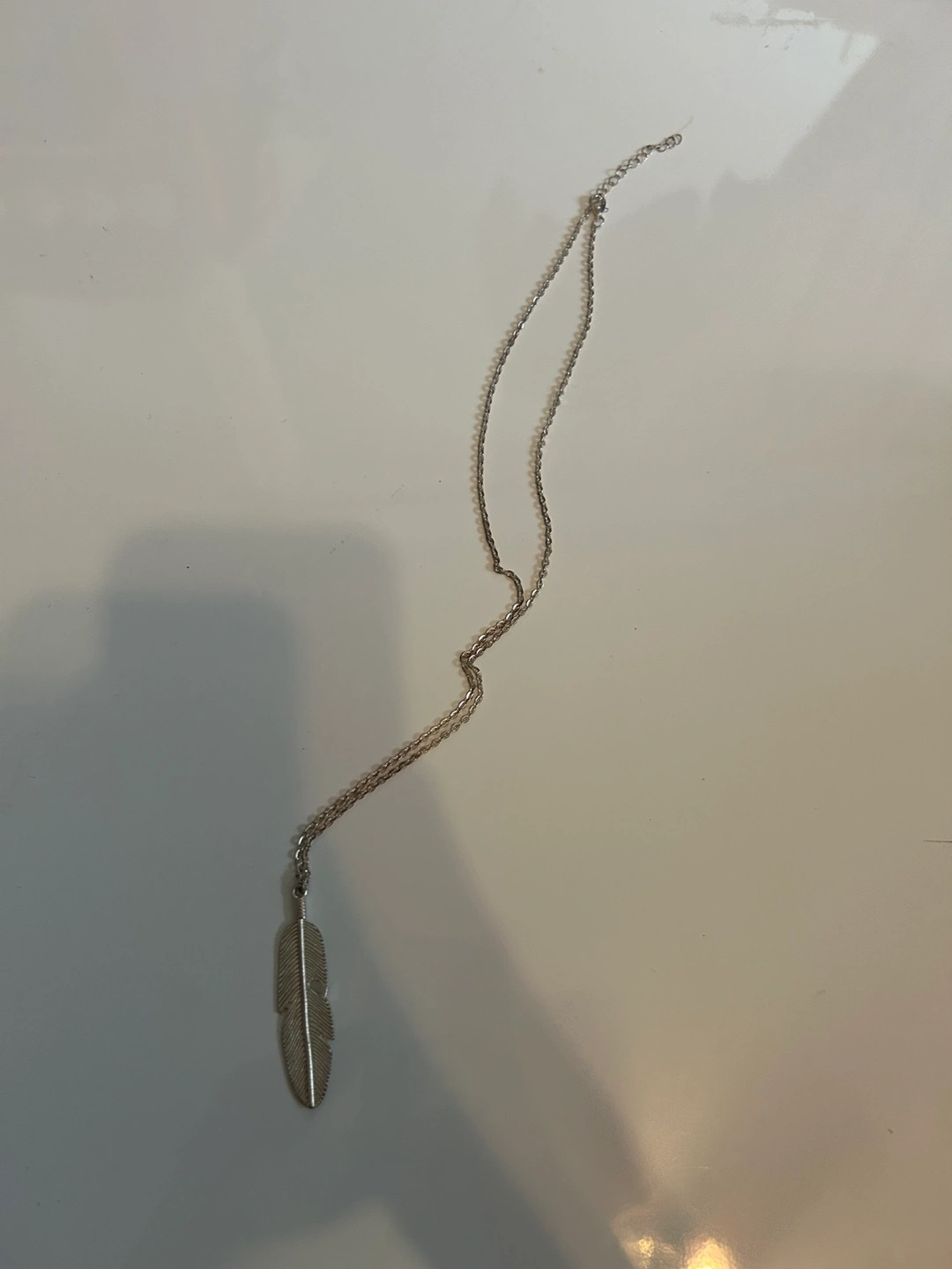 Selling a delicate silver-colored necklace with a feather pendant. It's a simple and elegant piece that can be worn with a variety of outfits. The chain is thin and the feather has nice detailing. Perfect for adding a touch of style to your look!