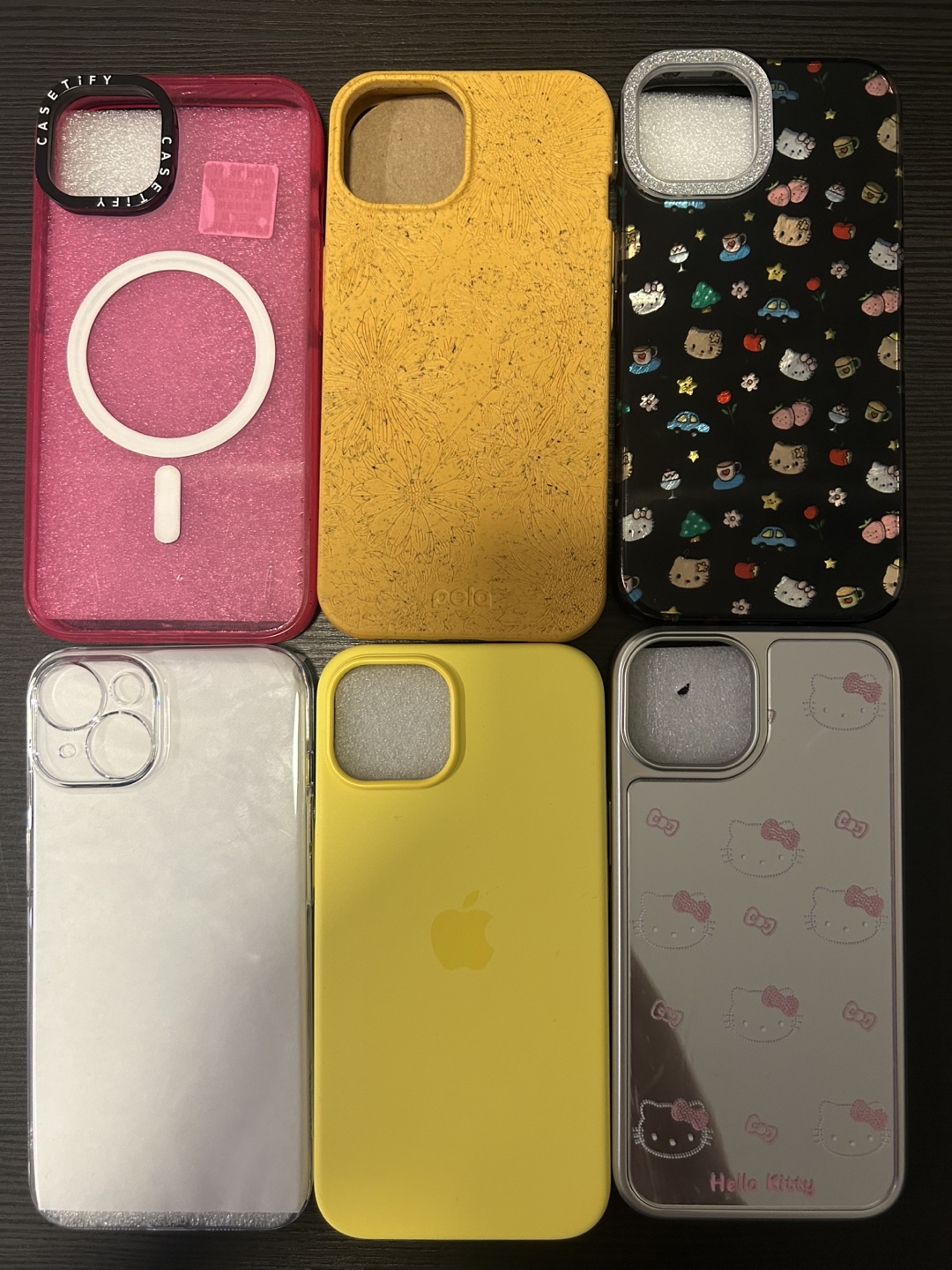 Selling a variety of iPhone cases! There's a Casetify case with MagSafe, a yellow Pela case with a floral design, an Apple yellow silicone case, and a Hello Kitty case.