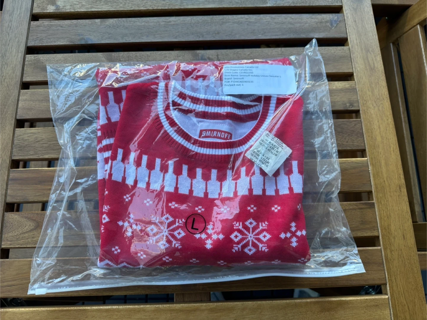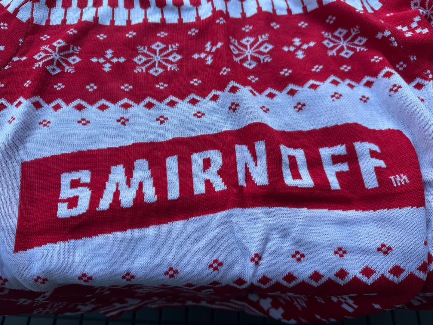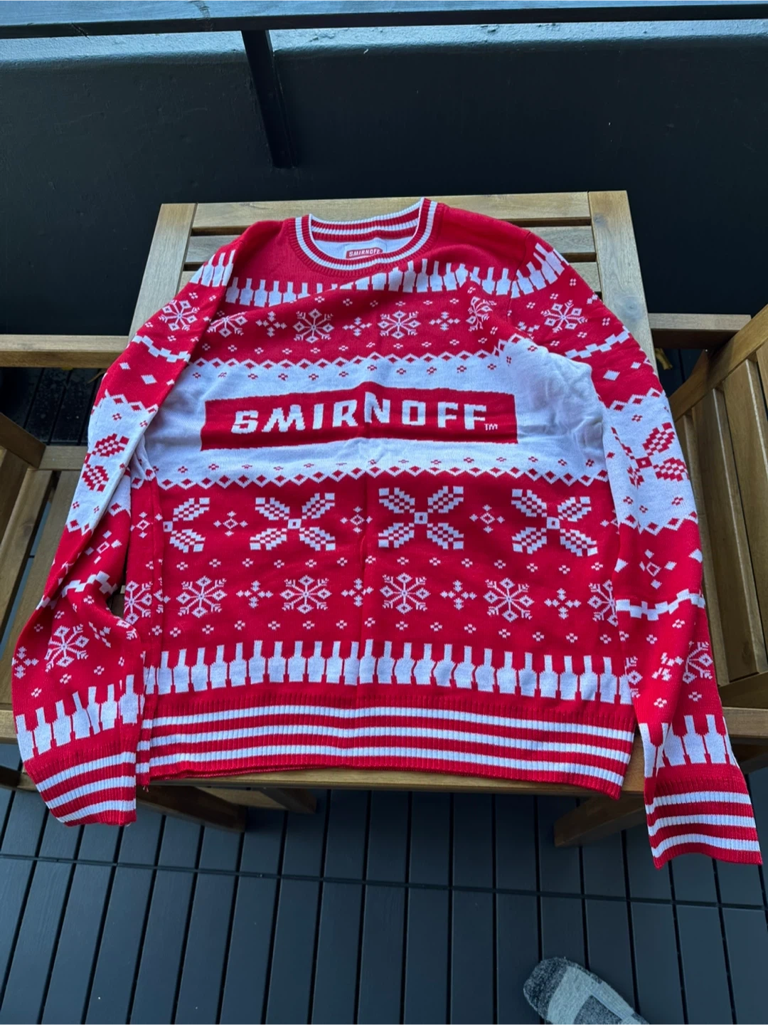 84Selling a brand new Smirnoff Holiday Unisex Sweater in size L! The sweater is red and white and features a festive design with snowflakes and the Smirnoff logo. Perfect for the holiday season!