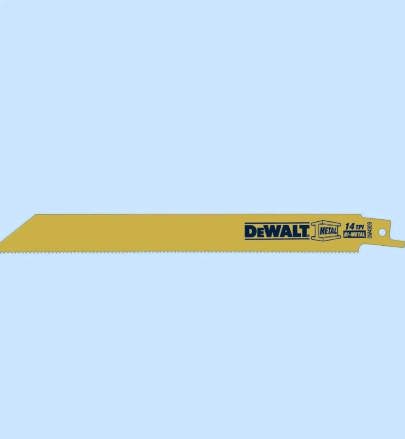 This is a 100-pack of DEWALT 8-inch reciprocating saw blades. They're designed for metal cutting with a 14 TPI (Teeth Per Inch) configuration. Blades are made of bi-metal construction for durability.