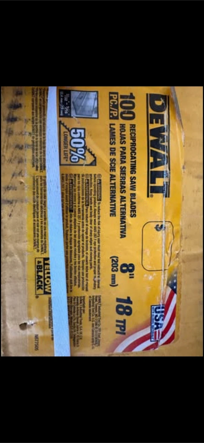 This is a 100-pack of DEWALT 8-inch reciprocating saw blades. They're designed for metal cutting with a 14 TPI (Teeth Per Inch) configuration. Blades are made of bi-metal construction for durability.