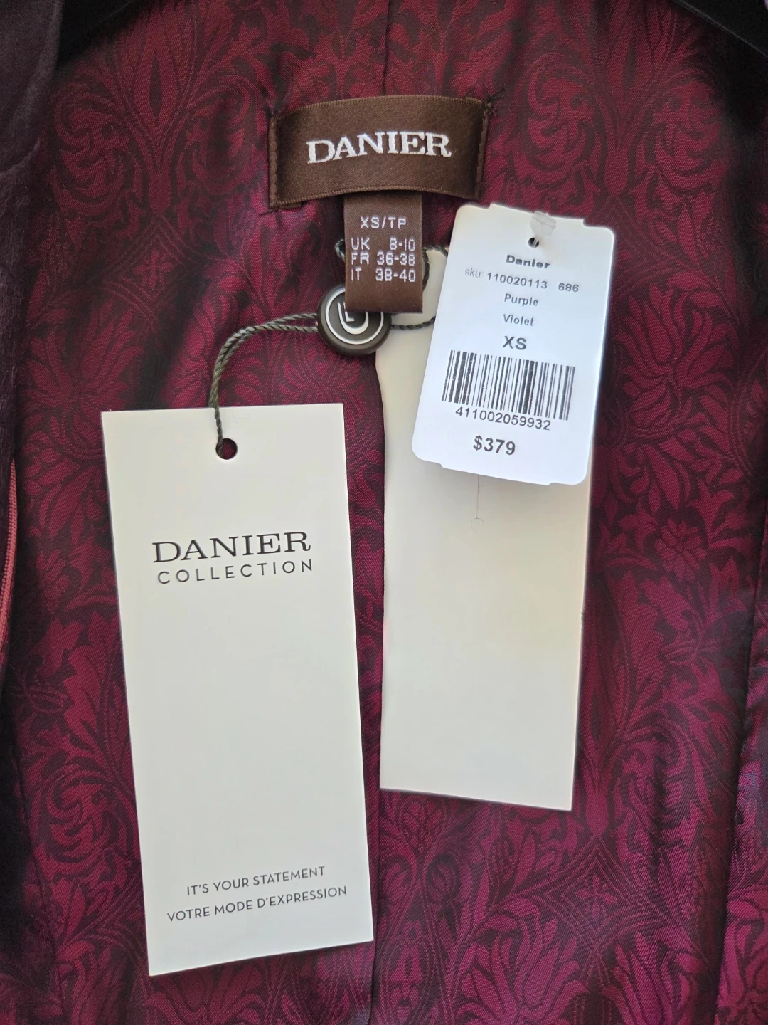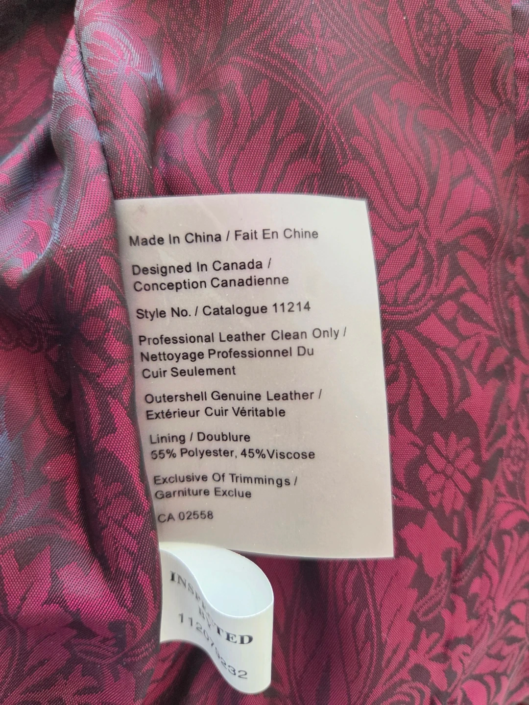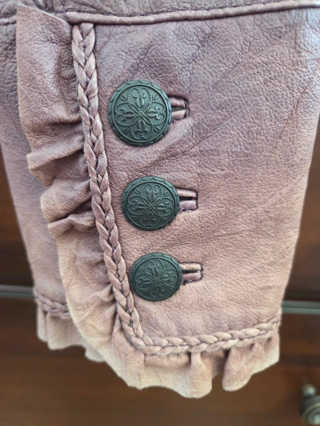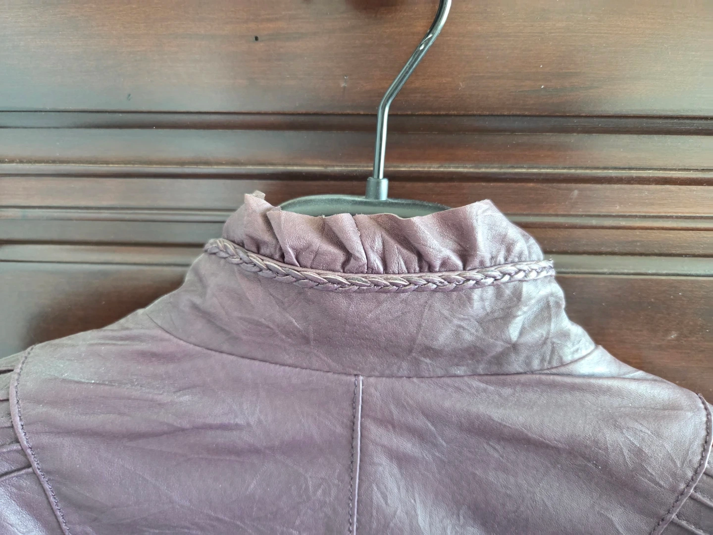 This is a stylish women's leather jacket in a lovely plum colour. It features a unique braided trim and ruffled detailing along the neckline and front zipper. The jacket also has decorative buttons on the cuffs. It's made from genuine leather and offers a flattering fitted silhouette.
