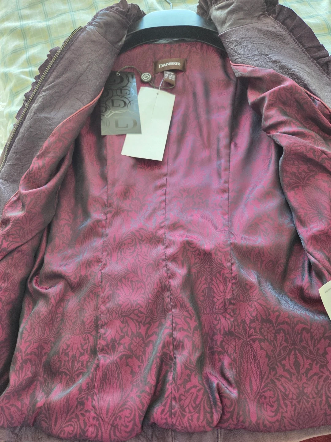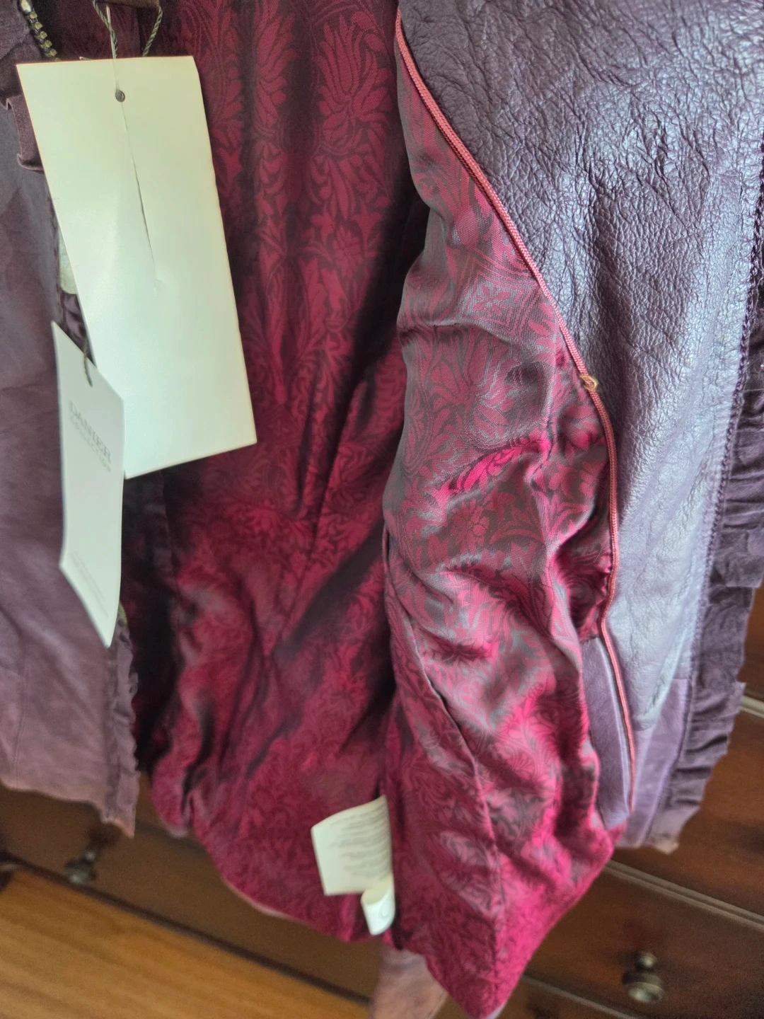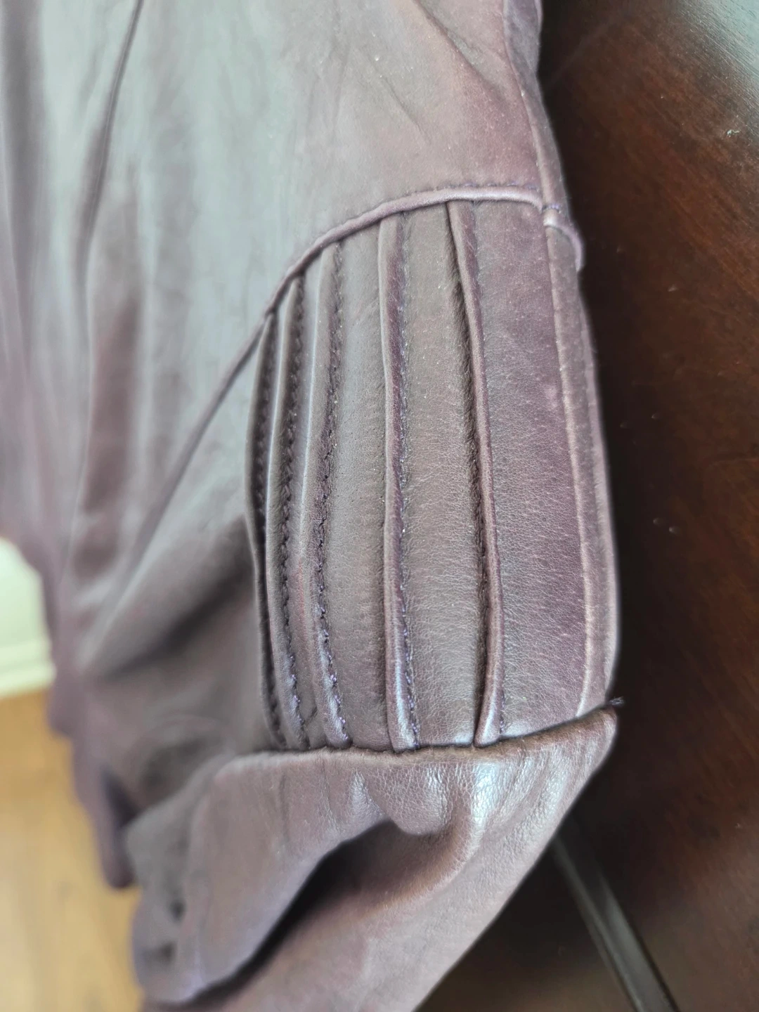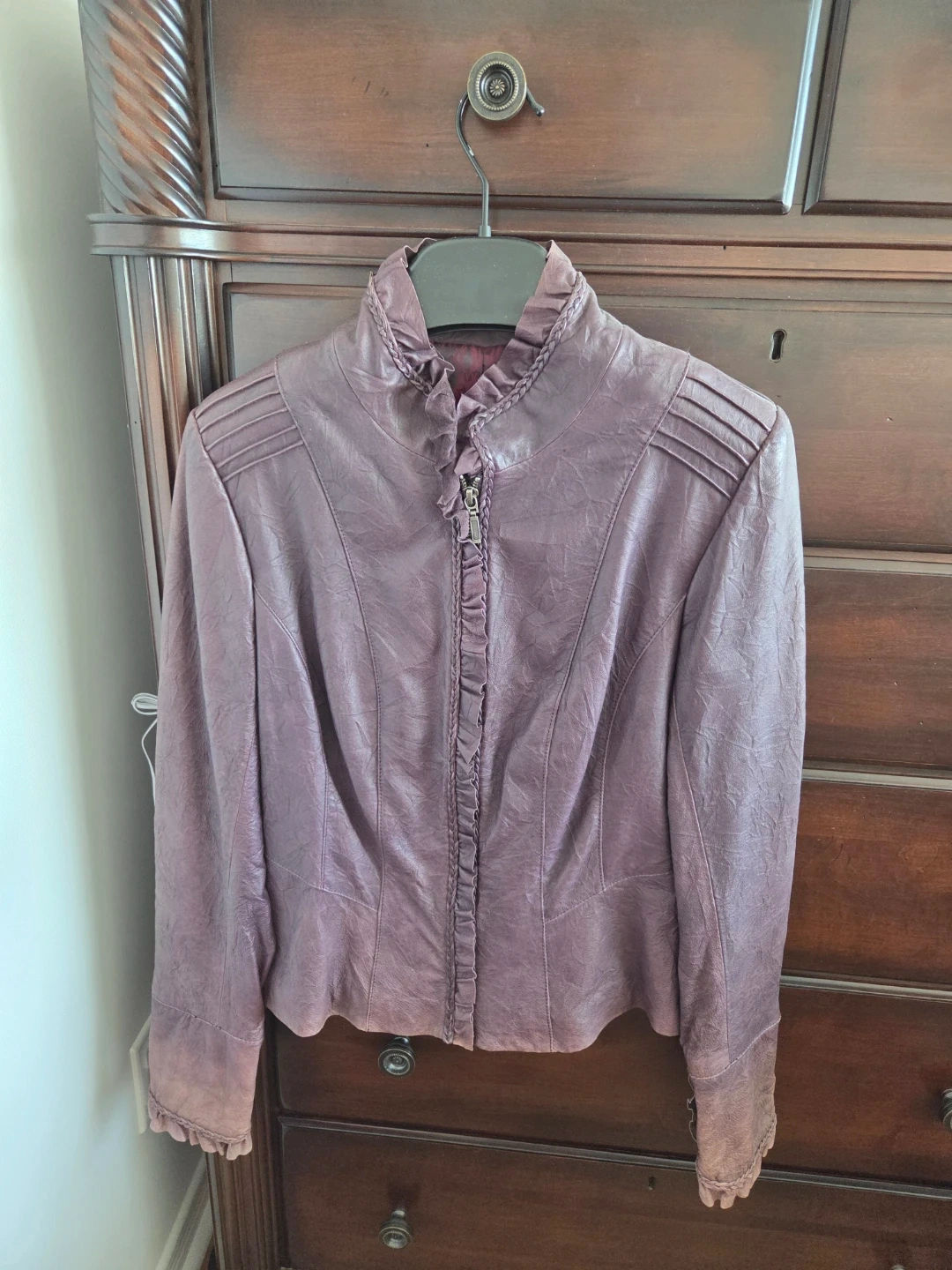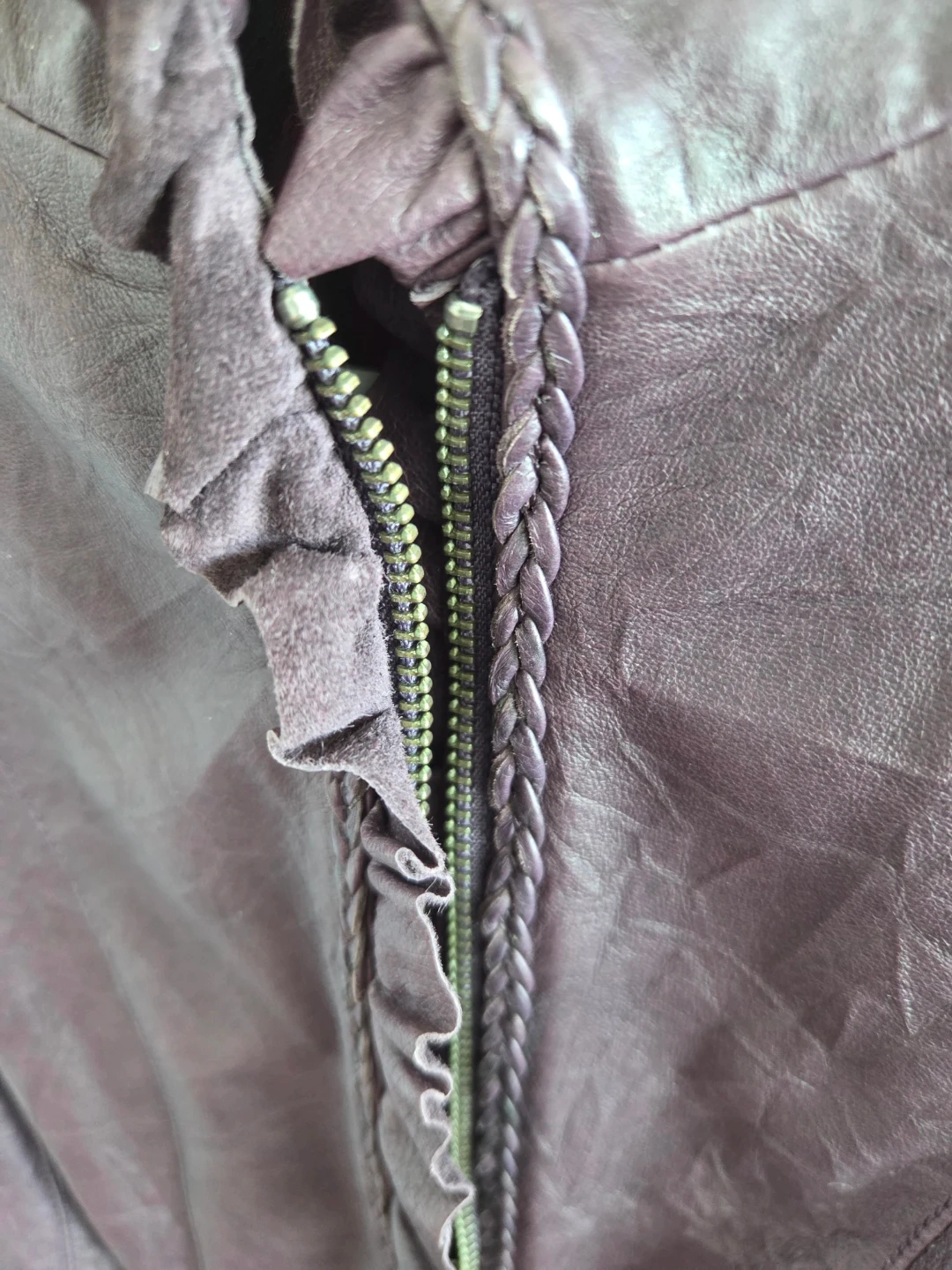 This is a stylish women's leather jacket in a lovely plum colour. It features a unique braided trim and ruffled detailing along the neckline and front zipper. The jacket also has decorative buttons on the cuffs. It's made from genuine leather and offers a flattering fitted silhouette.