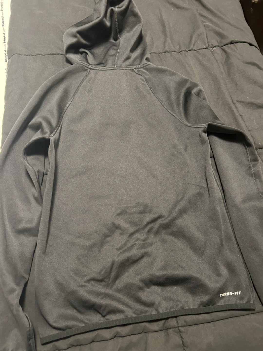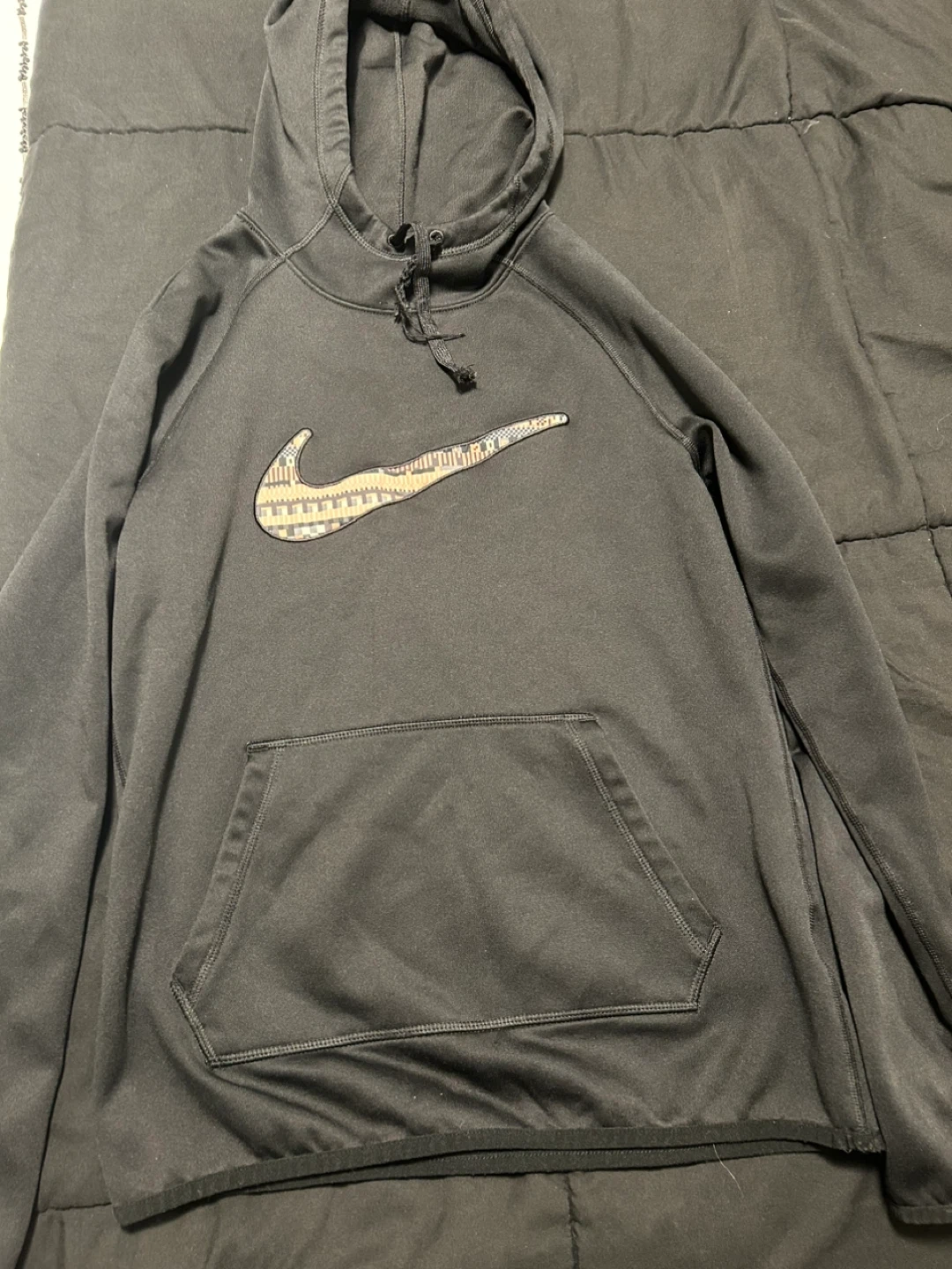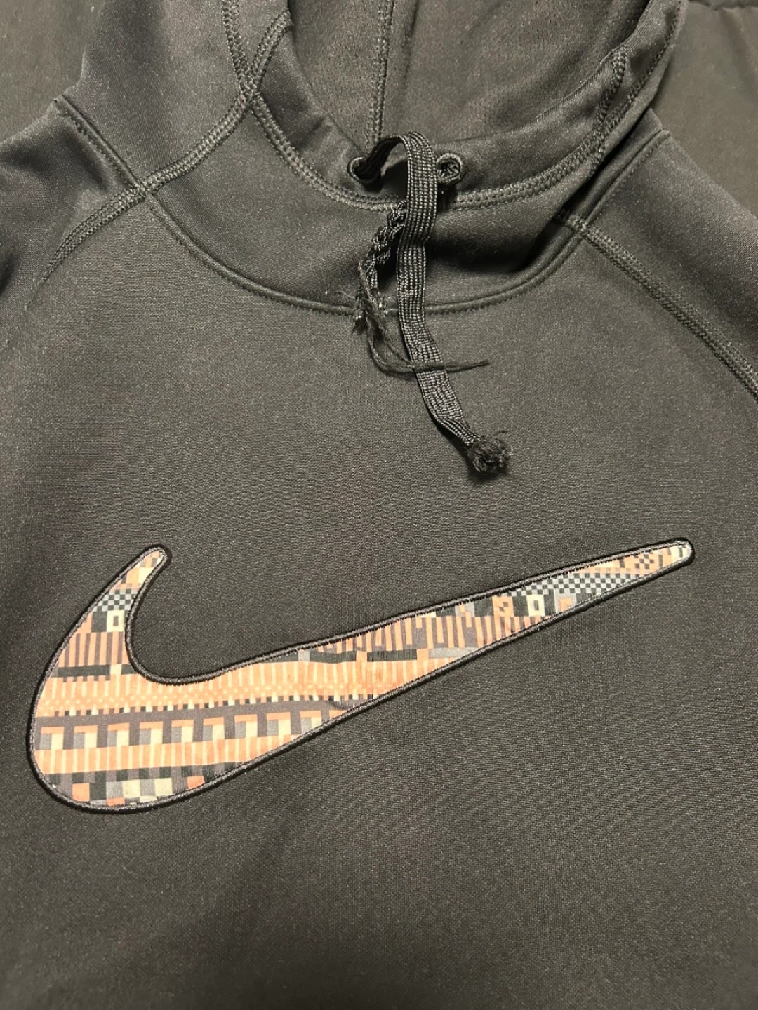 This is a black Nike Therma-FIT hoodie. It's a size XS and features the iconic Nike swoosh with a patterned fill. Made for comfort and warmth!