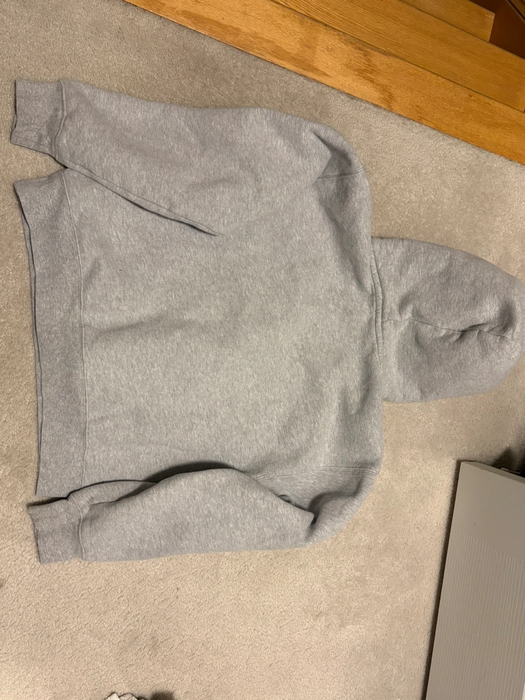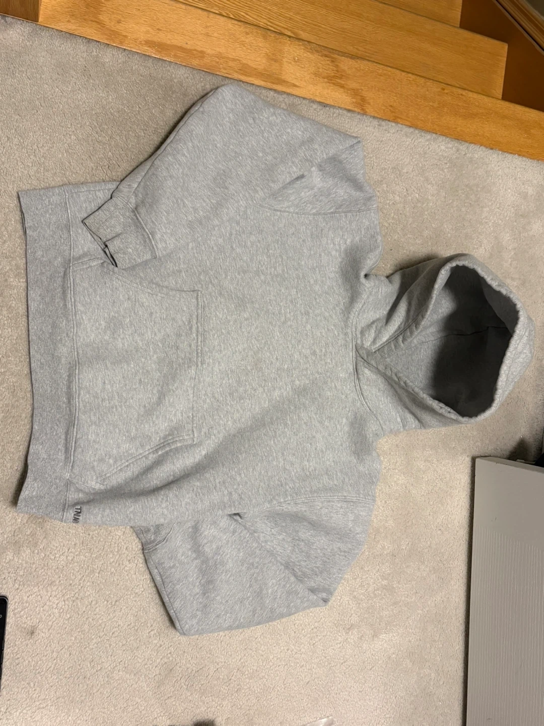 It's a TNA® Sweatfleece hoodie in grey. Size medium. Perfect Fit technology. Made in Cambodia.