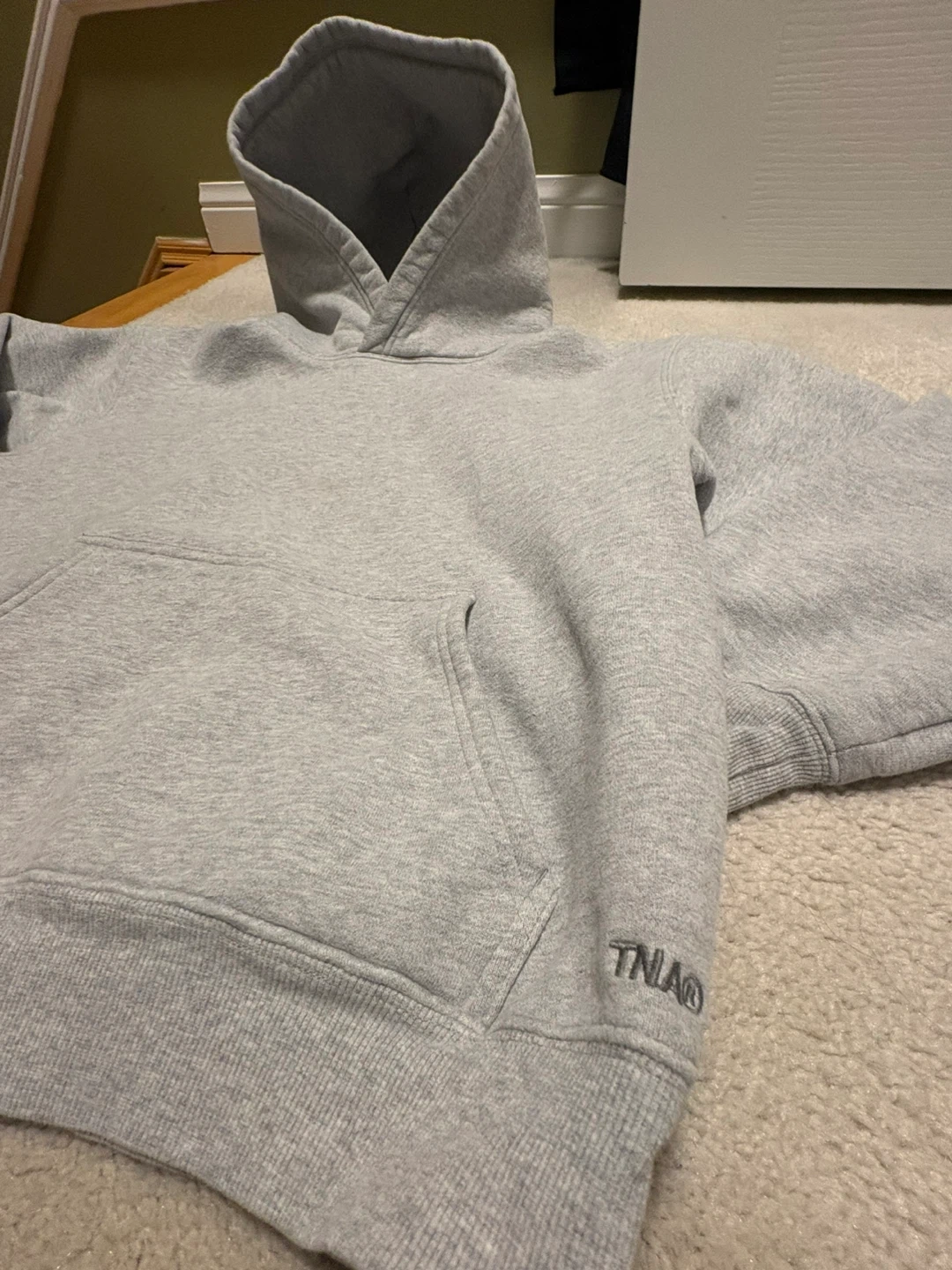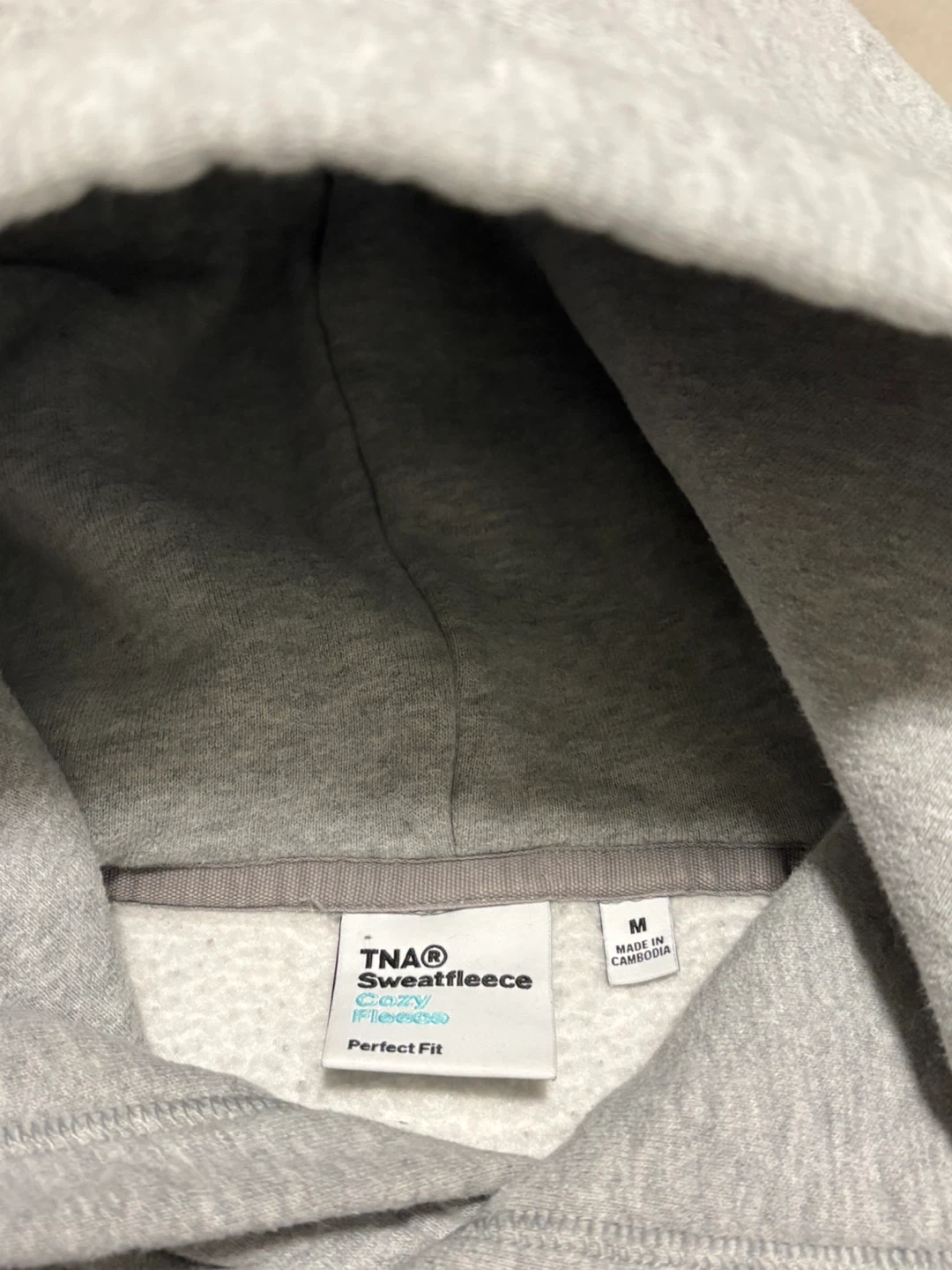 It's a TNA® Sweatfleece hoodie in grey. Size medium. Perfect Fit technology. Made in Cambodia.