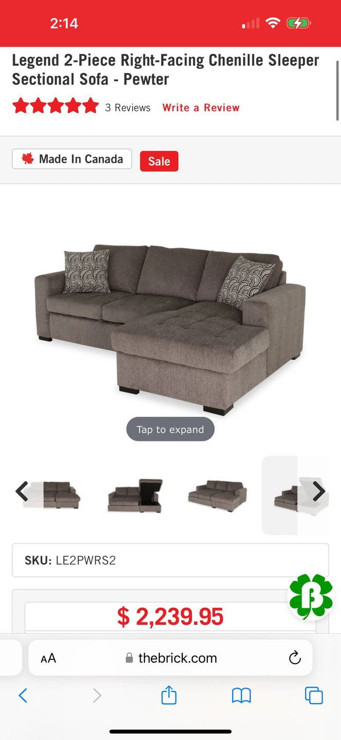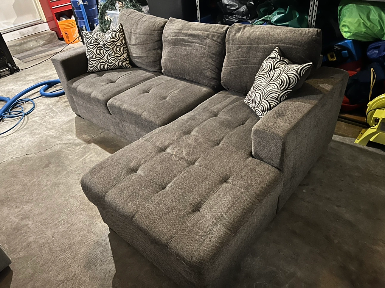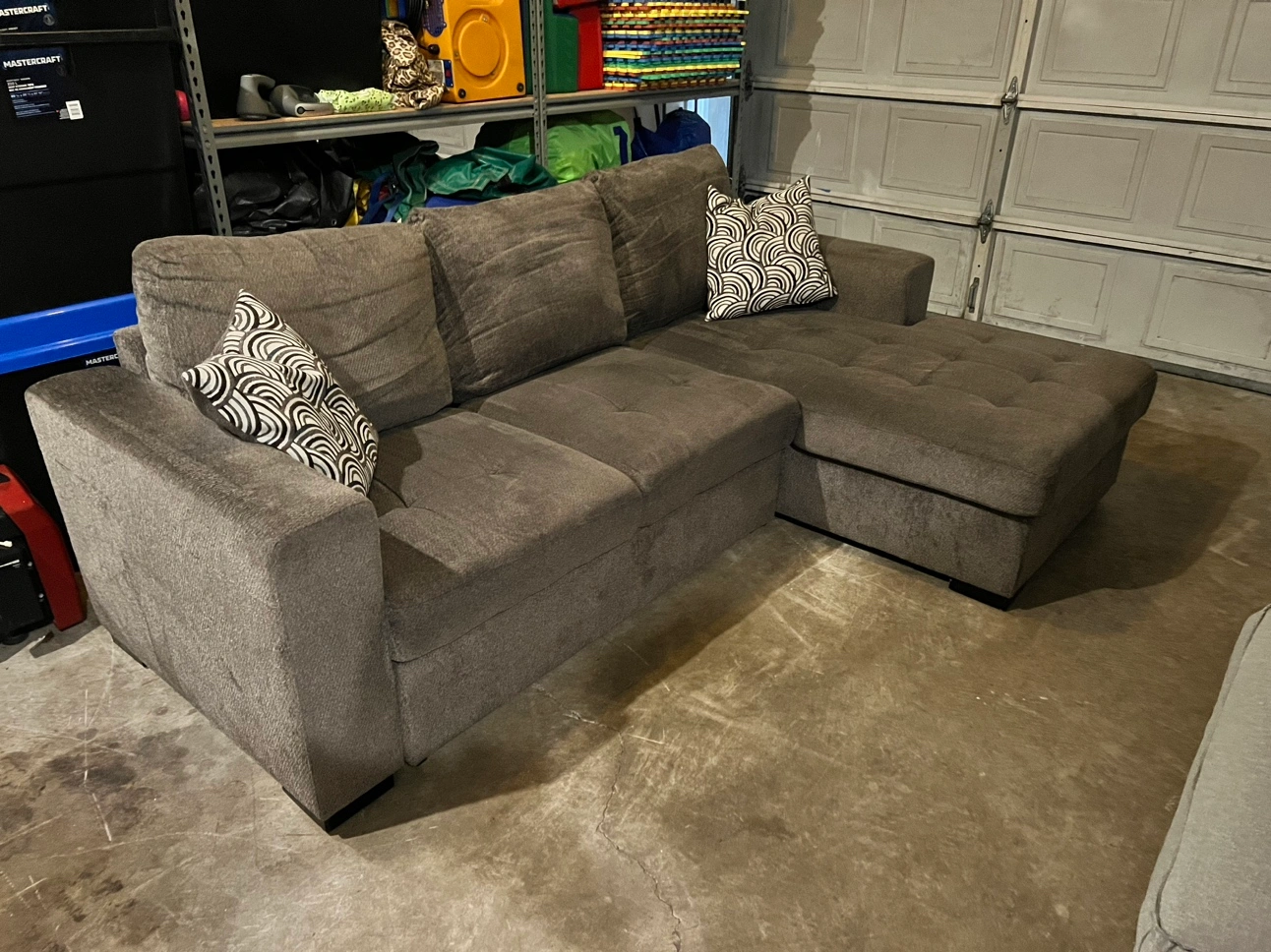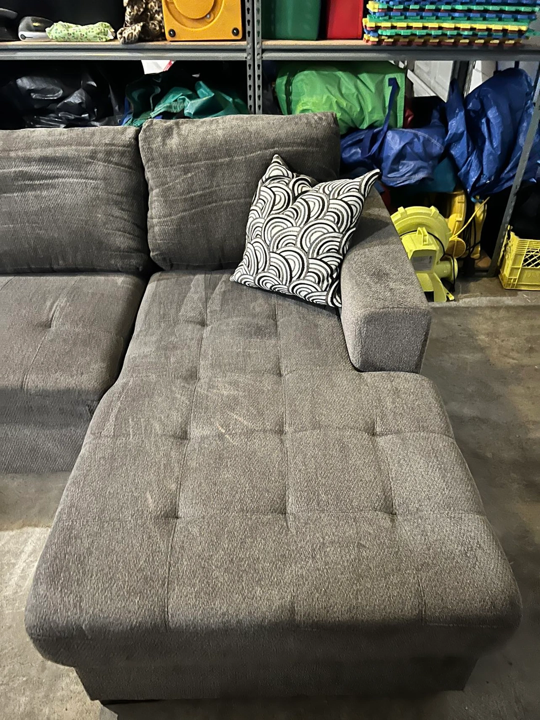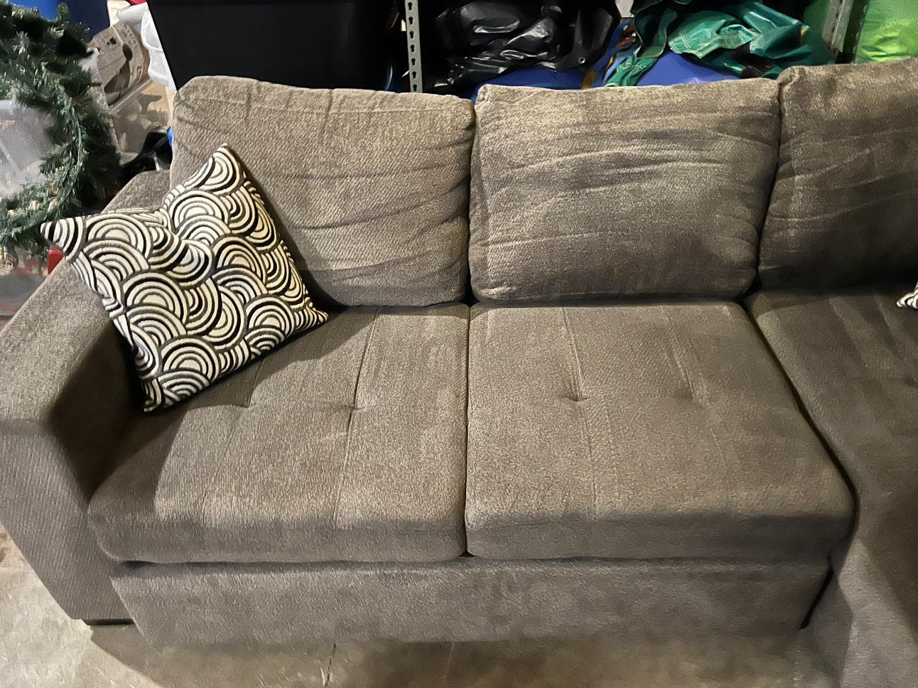 Good used condition! No rips or tears. There’s a pull out bed and storage on the chaise. Some marks from a flat iron on the chaise. But no stains. From a smoke free, occasionally pet friendly home.