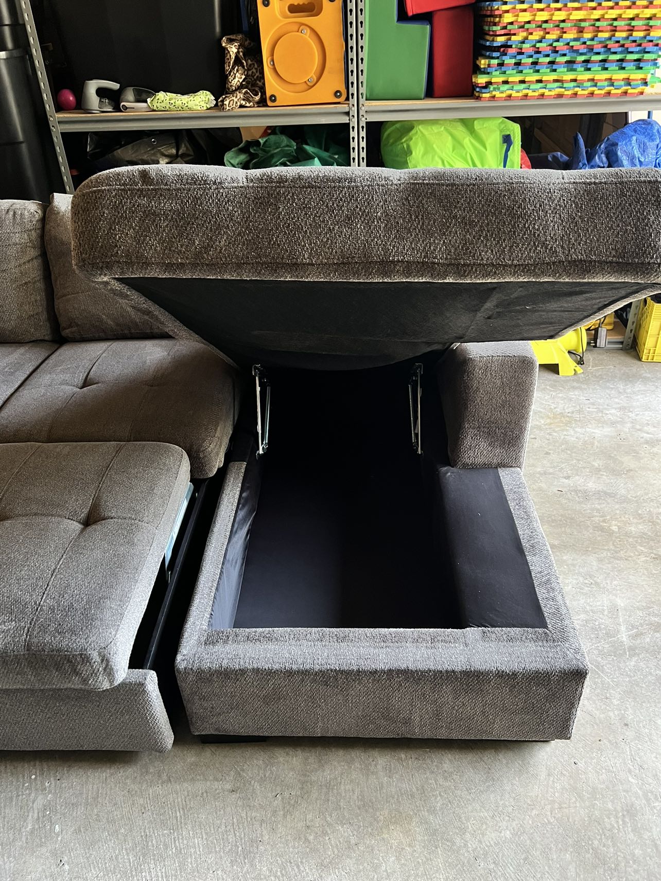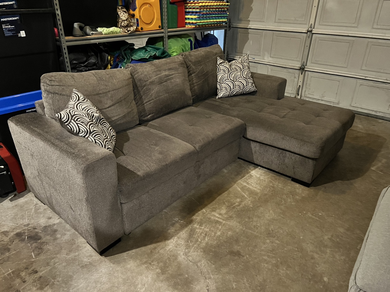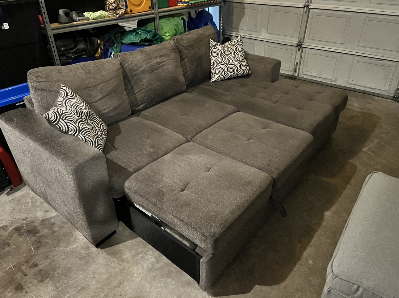 Good used condition! No rips or tears. There’s a pull out bed and storage on the chaise. Some marks from a flat iron on the chaise. But no stains. From a smoke free, occasionally pet friendly home.