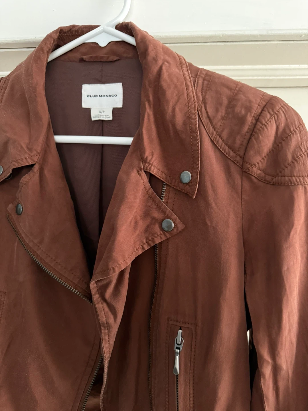 Stylish reddish brown biker jacket with zippers and buckles details. Size small but fits xsmall better :)
