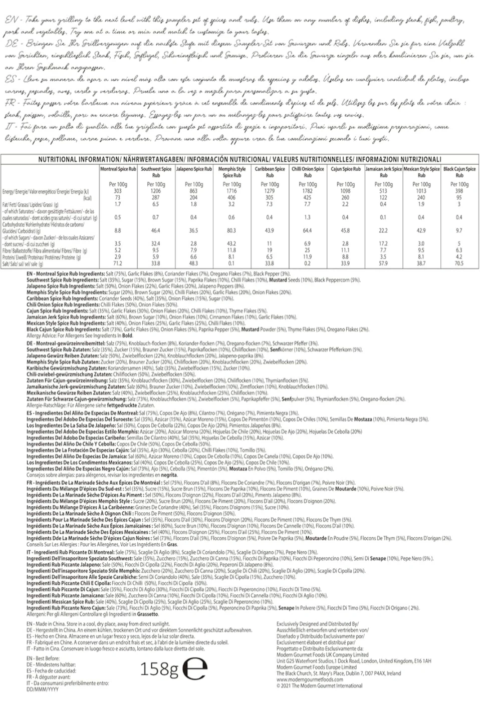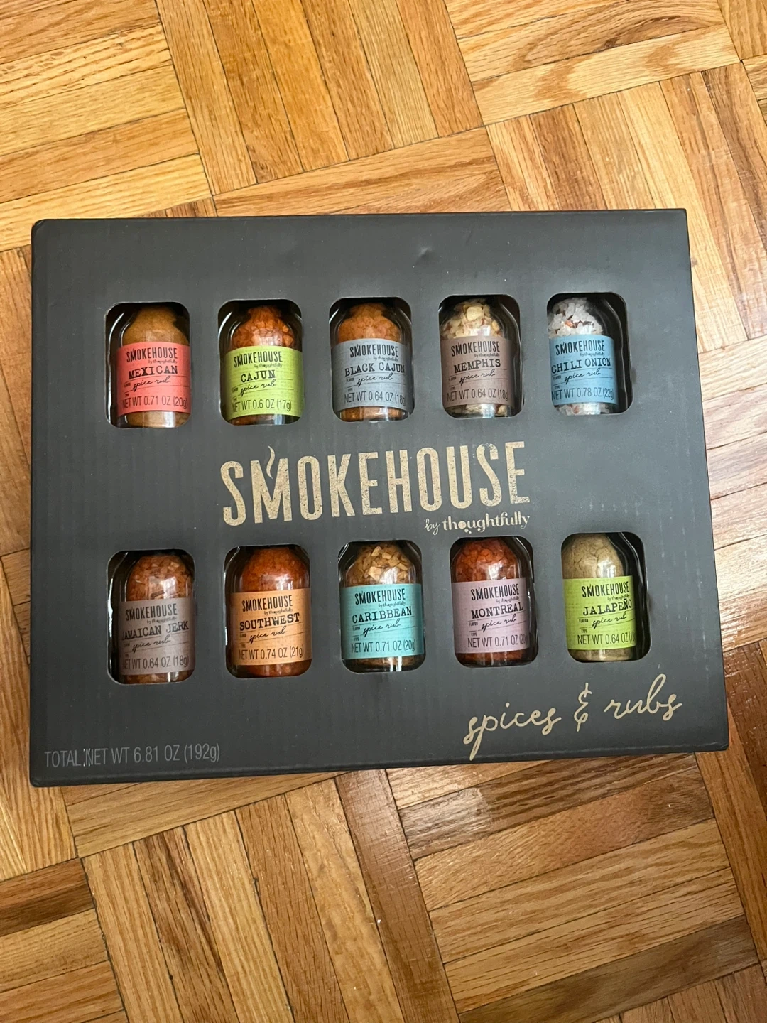 Spice up your grilling game with this Smokehouse by Thoughtfully spices and rubs set! This set includes ten unique spice blends, perfect for adding flavour to any dish. Each spice comes in its own little jar, making it easy to use and store. The set includes: - Southwest Spice Rub - Caribbean Spice Rub - Cajun Spice Rub - Memphis Spice Rub - Mexican Spice Rub - Black Cajun Spice Rub - Jalapeno Spice Rub - Jamaican Jerk Spice Rub - Montreal Spice Rub - Chili Onion Spice Rub