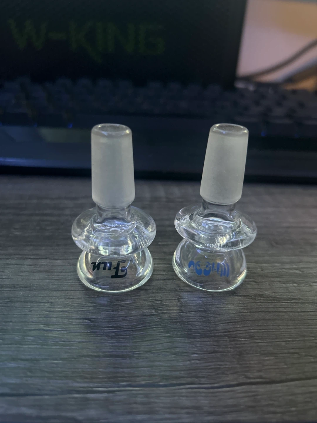 15Selling two glass funnel adapters. One has 'Fun' written on it, and the other has a blue design. They're in good condition and ready for a new home!