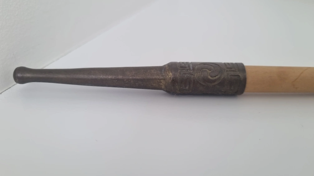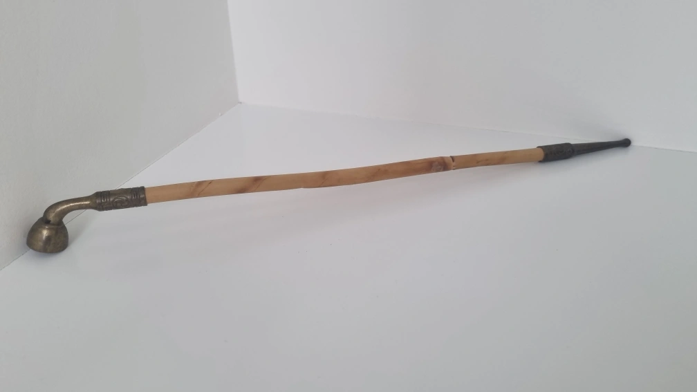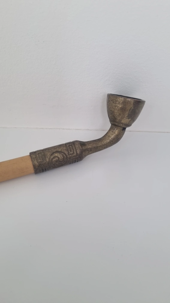 109a vintage smoking pipe. It has a unique design with metal accents and a wooden stem. It is in used condition but still has a lot of character old chineesr smoking pipe