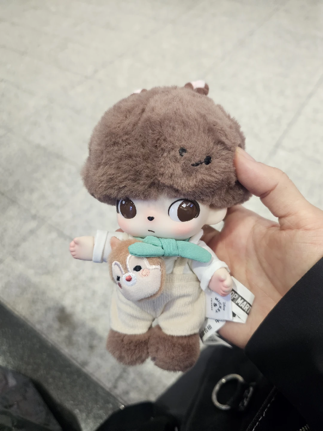 The plush is brown and beige with a little green scarf and a squirrel pouch.