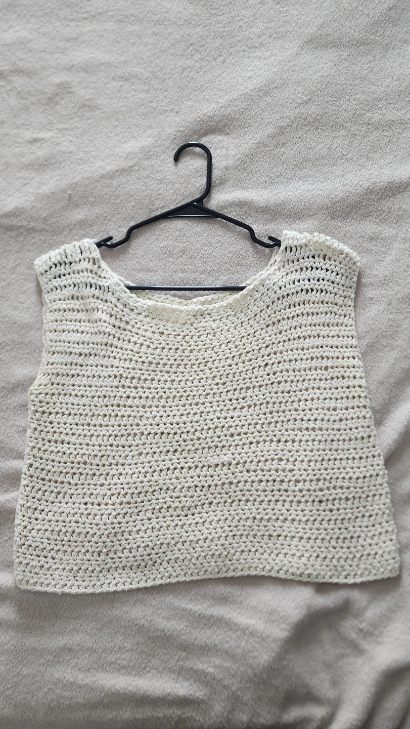 Cream colored, sleeveless crocheted tank top. Material appears to be cotton or a cotton blend. It's a handmade item with a relaxed fit.