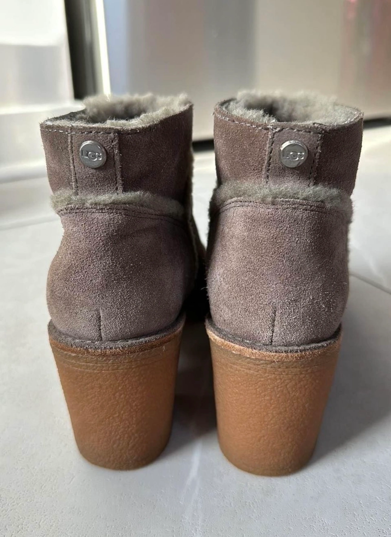 Grey suede ankle boots with a block heel and sheepskin lining. The boots are in excellent condition with minor signs of wear on heel. Please see photos for details.