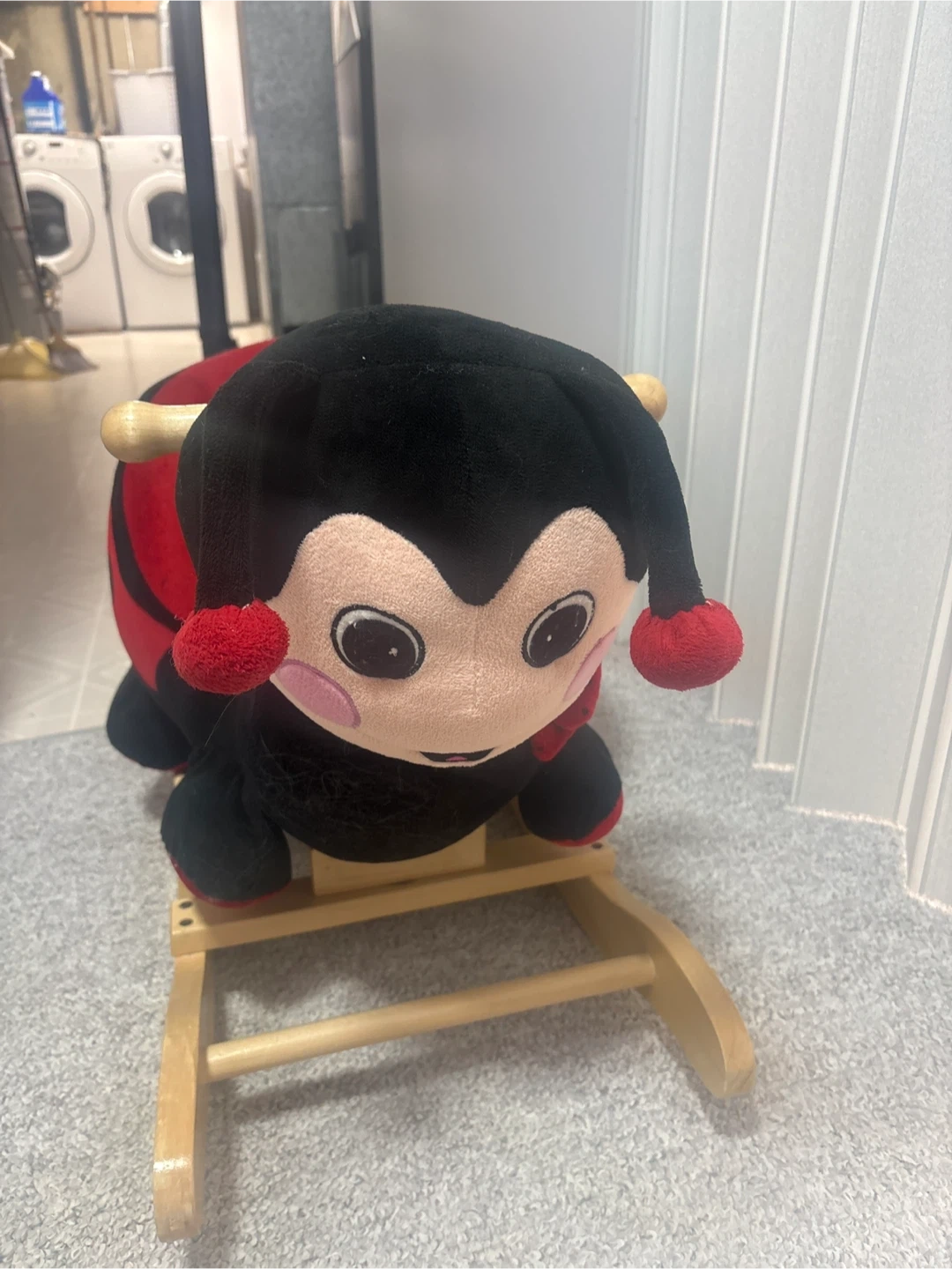 A cute ladybug plush rocking toy with wooden rockers. It's soft and perfect for little ones. The plush is black and red with adorable pom-pom antennae. Pick up cash only