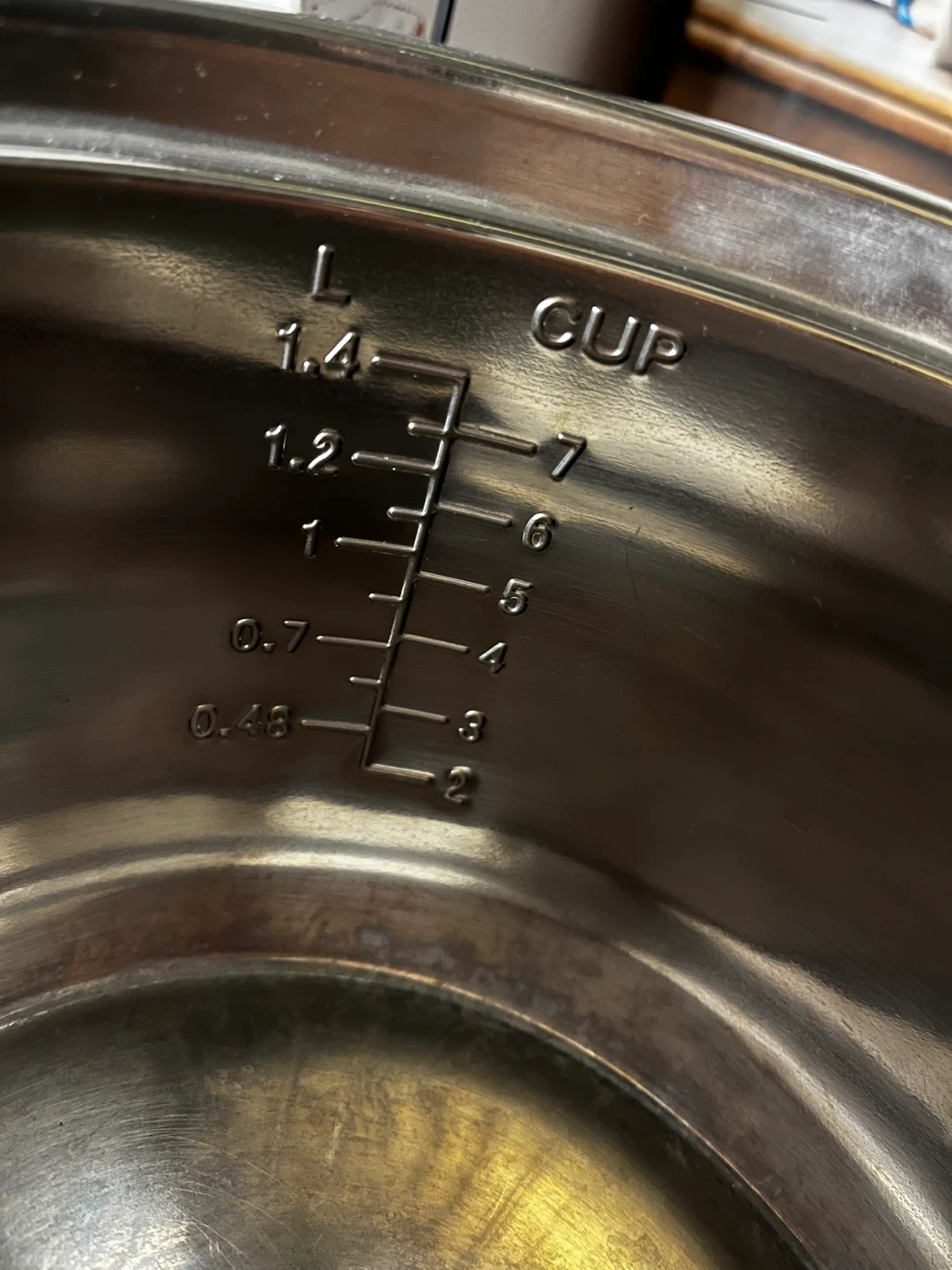 š¤It features a stainless steel inner pot with clear L and CUP measurements.