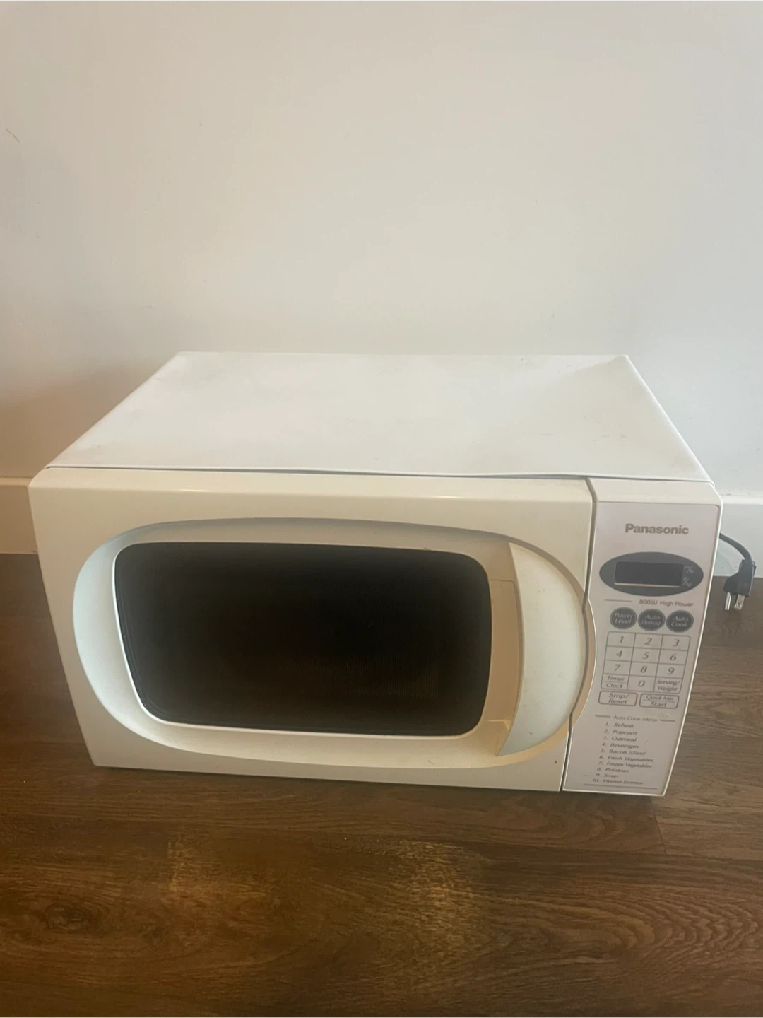 This is a white Panasonic microwave oven with 800W of high power. It has a digital display and various auto cook presets. Dimensions are standard for a countertop microwave.