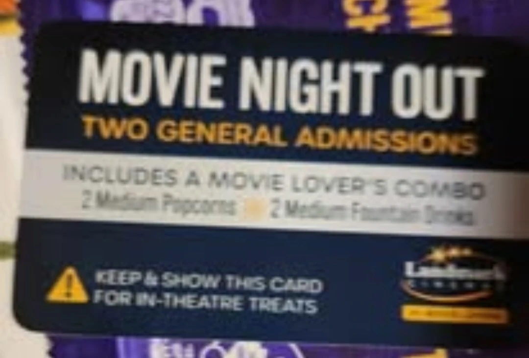 This voucher includes two general admissions tickets. It also includes a Movie Lover's Combo with two medium popcorns and two medium fountain drinks. Keep and show this card for in-theatre treats! Never used I got it my birthday please contact me pick up only No e transfer cash only thank you great taking your boyfriend or girlfriend or husband or wife or your family or friend