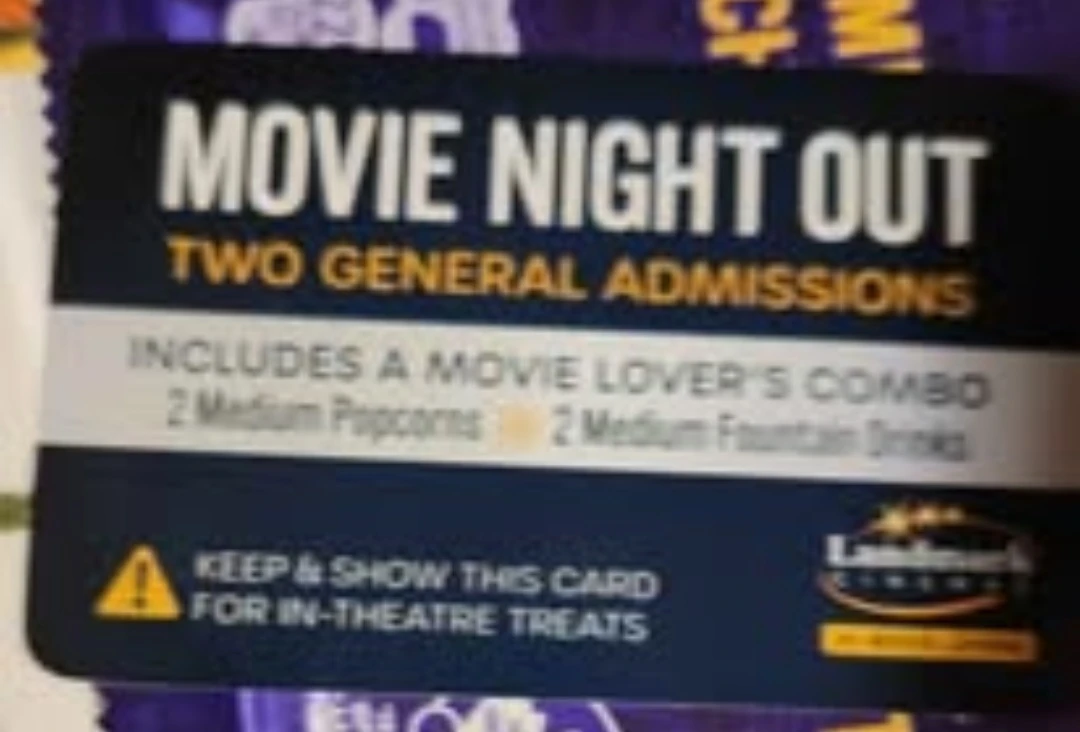 This voucher includes two general admissions tickets. It also includes a Movie Lover's Combo with two medium popcorns and two medium fountain drinks. Keep and show this card for in-theatre treats! Never used I got it my birthday please contact me pick up only No e transfer cash only thank you great taking your boyfriend or girlfriend or husband or wife or your family or friend
