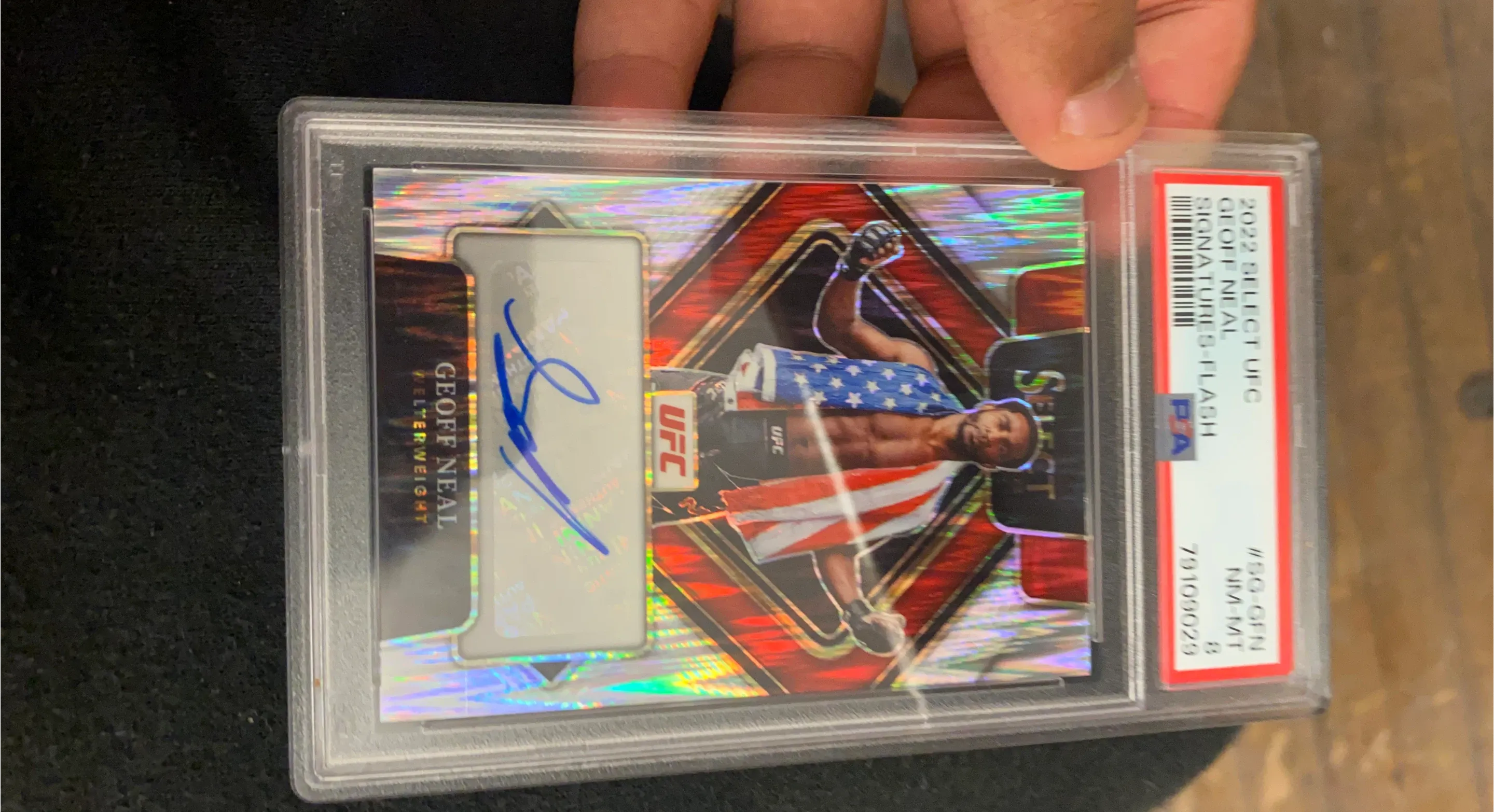 This is a 2022 Select UFC Geoff Neal autographed flash card. It's graded NM-MT 8 by PSA. The card features Geoff Neal, a welterweight fighter.
