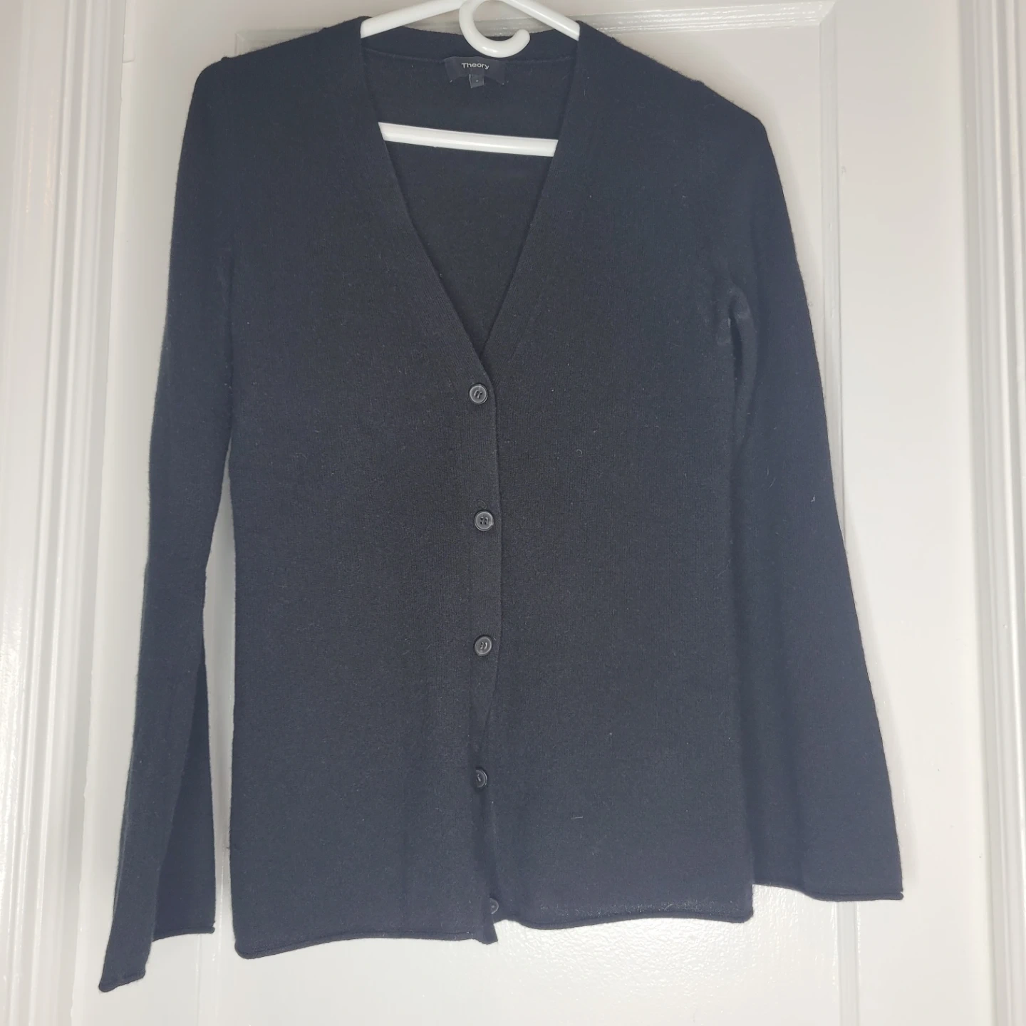 A Theory black cardigan made from 100% cashmere. It features bell sleeves and a button-up front. Size is small. Made in China. Dry clean only. Some pilling under arms.