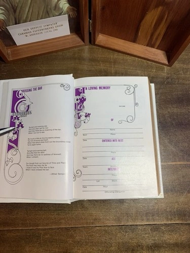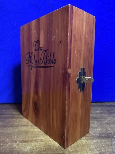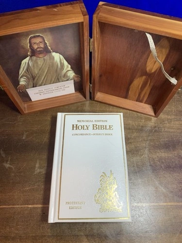 Offered for sale is a beautiful and distinctive Memorial Edition Holy Bible, Protestant Edition, complete with concordance and subject index, housed in a solid wooden presentation case featuring a hinged door with metal latch and a devotional image of Jesus Christ displayed inside. This is not just a Bible — it is a reverent keepsake and memorial piece, ideal for display, remembrance, and devotional use. The wooden case evokes the appearance of a small chapel or shrine, making it especially meaningful for home altars, prayer corners, memorials, or church settings. Inside the case, the Bible rests securely and includes illustrated devotional pages, ribbon marker, and study aids to support deeper engagement with Scripture. Key Features: Memorial Edition Holy Bible – Protestant Edition, Includes Concordance & Subject Index, Solid wooden presentation/display case, Hinged case with metal latch closure, Devotional image of Jesus Christ inside the case, Ribbon bookmark included, Illustrated devotional inserts and study materials. Condition: Very Good Pre-Owned Condition. Bible pages are clean and legible, Binding is intact and secure, No missing pages observed. Wooden case shows minor surface wear and small marks consistent with age and respectful use. Hinges and latch function properly. Please review all photos carefully — they show the exact item you will receive and form part of the description. Perfect For: Memorial or remembrance gifts, Home prayer or devotional spaces, Church offices or chapels, Christian collectors, Sympathy or bereavement gifts, Confirmation, baptism, or family keepsake. This style of wood-cased Memorial Bible is increasingly difficult to find and is highly appreciated for its symbolic, devotional, and display value. A meaningful and dignified piece that blends faith, craftsmanship, and remembrance.