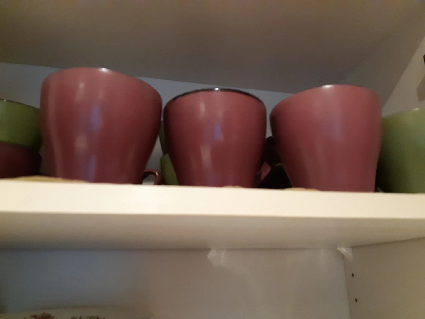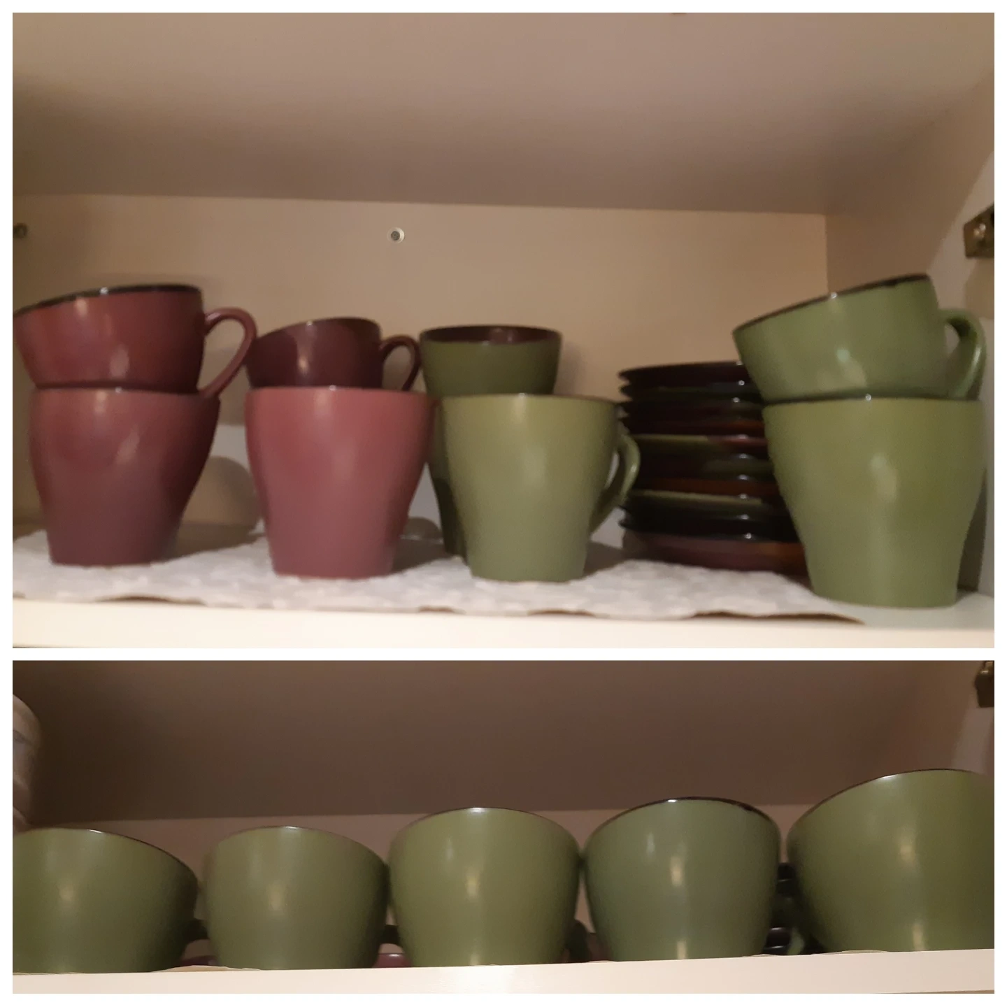 This very high quality of set of 20 coffee or tea cups and matching saucers come in two colours 10 pcs, plum and 10 pcs sage green, with black rims The saucers are plum-coloured with a black rim. Made of ceramic. Perfect for your morning coffee or afternoon tea!