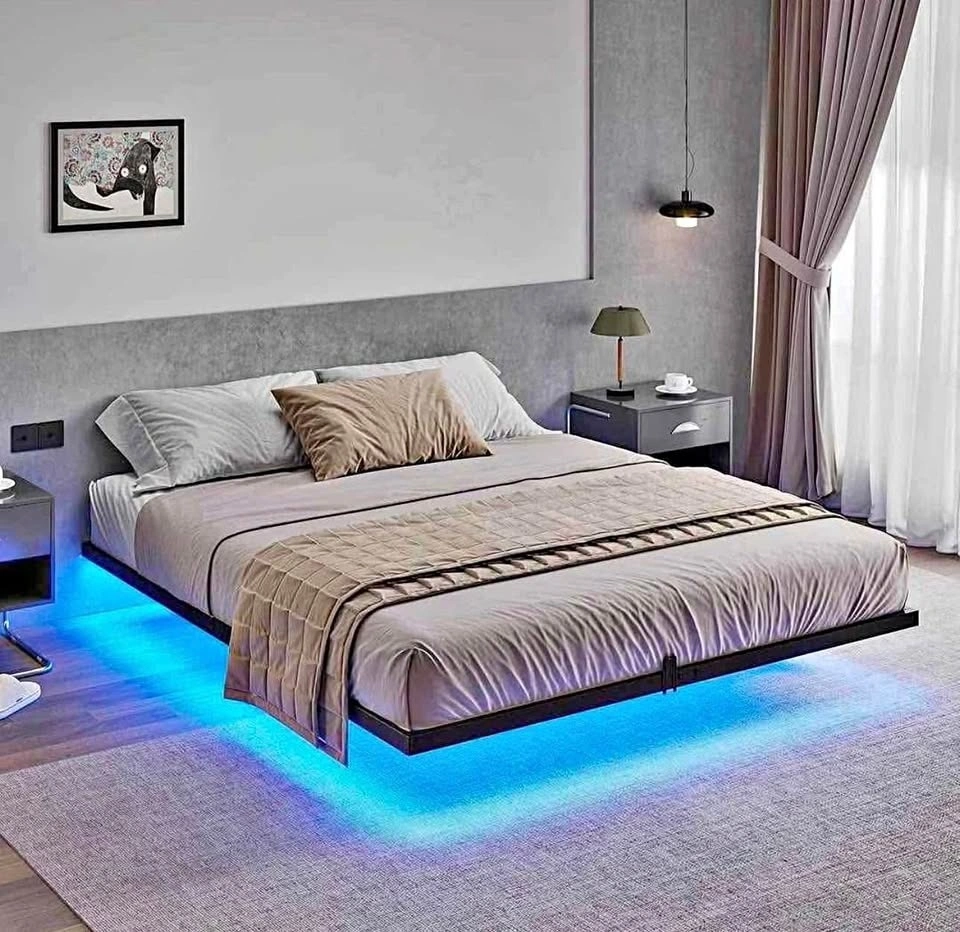 Brand New in Box. King size floating bed frame. Features a floating design for a unique look, supported by internal legs for stability. Includes a multi-color LED light strip with music sync and timer, controlled by remote or app. Also has a built-in charging station with 2 AC outlets and 2 USB ports. Designed for silent and stable use with mattress stoppers and anti-slip pads. Made of durable metal with 11 slats for mattress support. Assembly is straightforward with clear instructions.