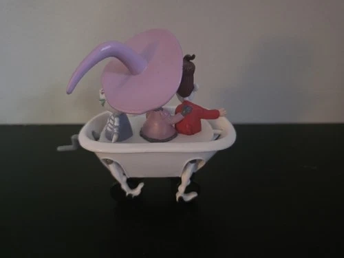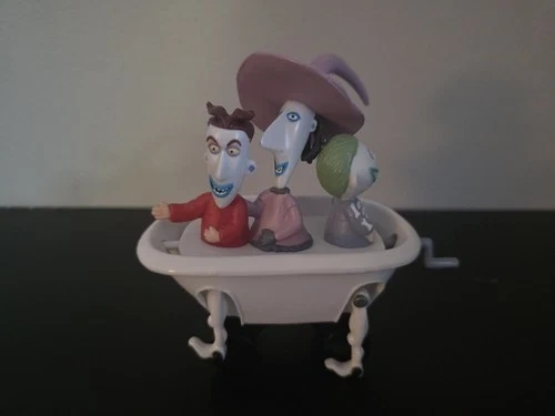 Vintage Lock, Shock & Barrel Roll Along Toy from Disney’s The Nightmare Before Christmas, produced in 1993. This classic piece features Lock, Shock, and Barrel riding together in a bathtub-style rolling cart with a push handle. A fun and iconic early collectible from the original Nightmare Before Christmas merchandise line. Pre-owned and in very good vintage condition. Figures and cart are intact with light wear consistent with age. Paint remains clean and detailed. A great display piece for fans and collectors of Nightmare Before Christmas. Please review all photos for exact condition.