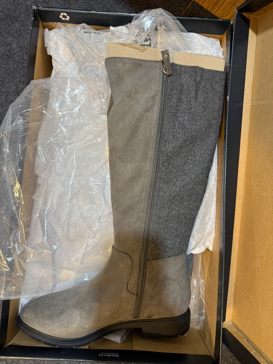 Dr. Scholl's tall boots featuring a suede-like material and a wool-blend shaft. These boots have a full-length zipper for easy on and off. They are made in Vietnam.