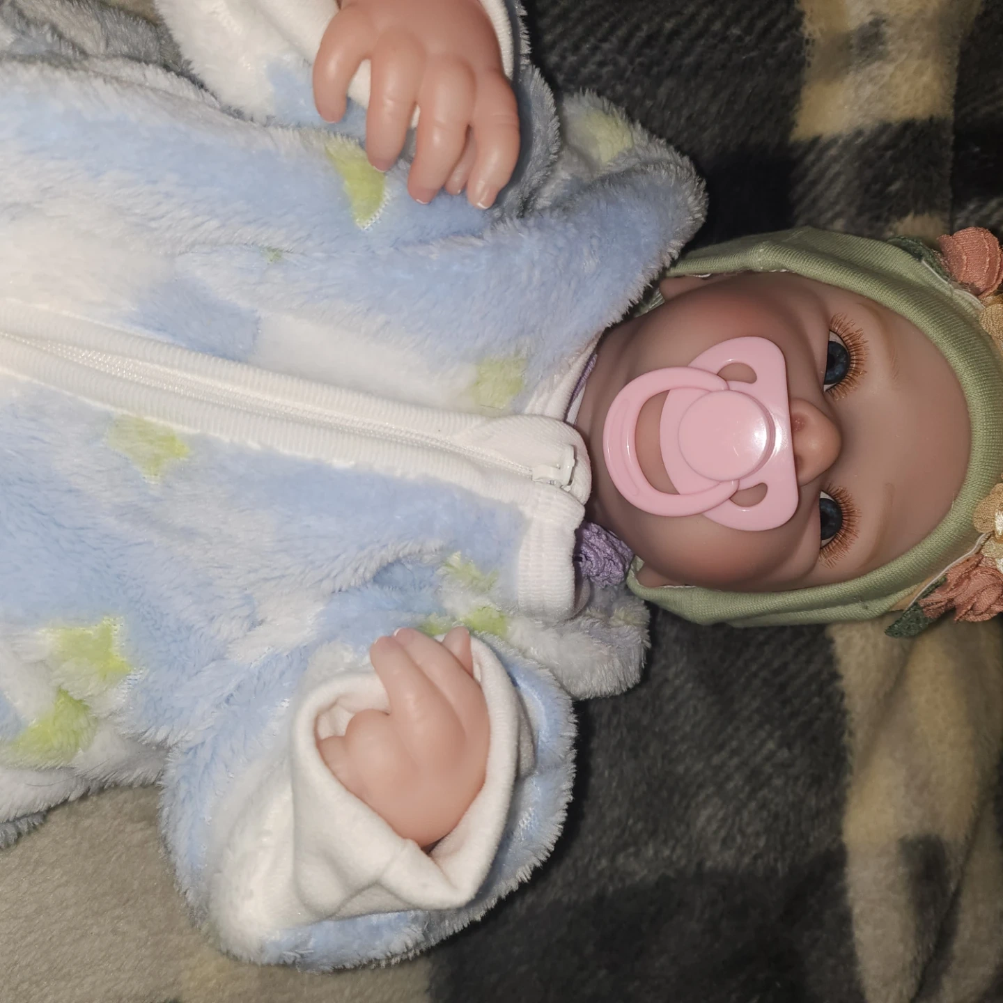 Realistic reborn baby doll. Includes pacifier. Soft, vinyl body. Suitable for collectors or children. Baby will come home in a sleeper (footed pjs) with a headband. Baby is a girl and anatomically correct.