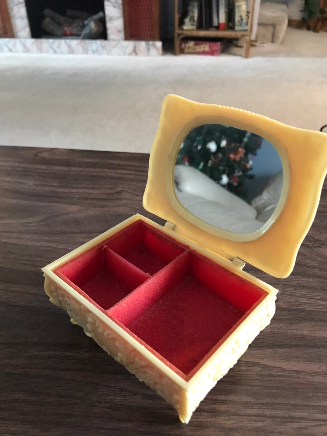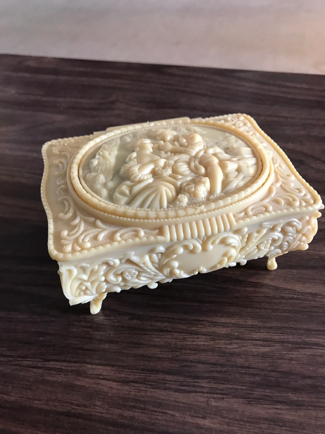 This ornate jewelry box has a classic design with embossed figures on the lid. It features a velvet-lined interior with compartments and a small mirror inside. Great for storing small trinkets or rings! Vintage jewelry box. Made in Hong Kong. 5” long 3 1/4” wide 2 1/4” tall. Not sure what its made of. $15.00