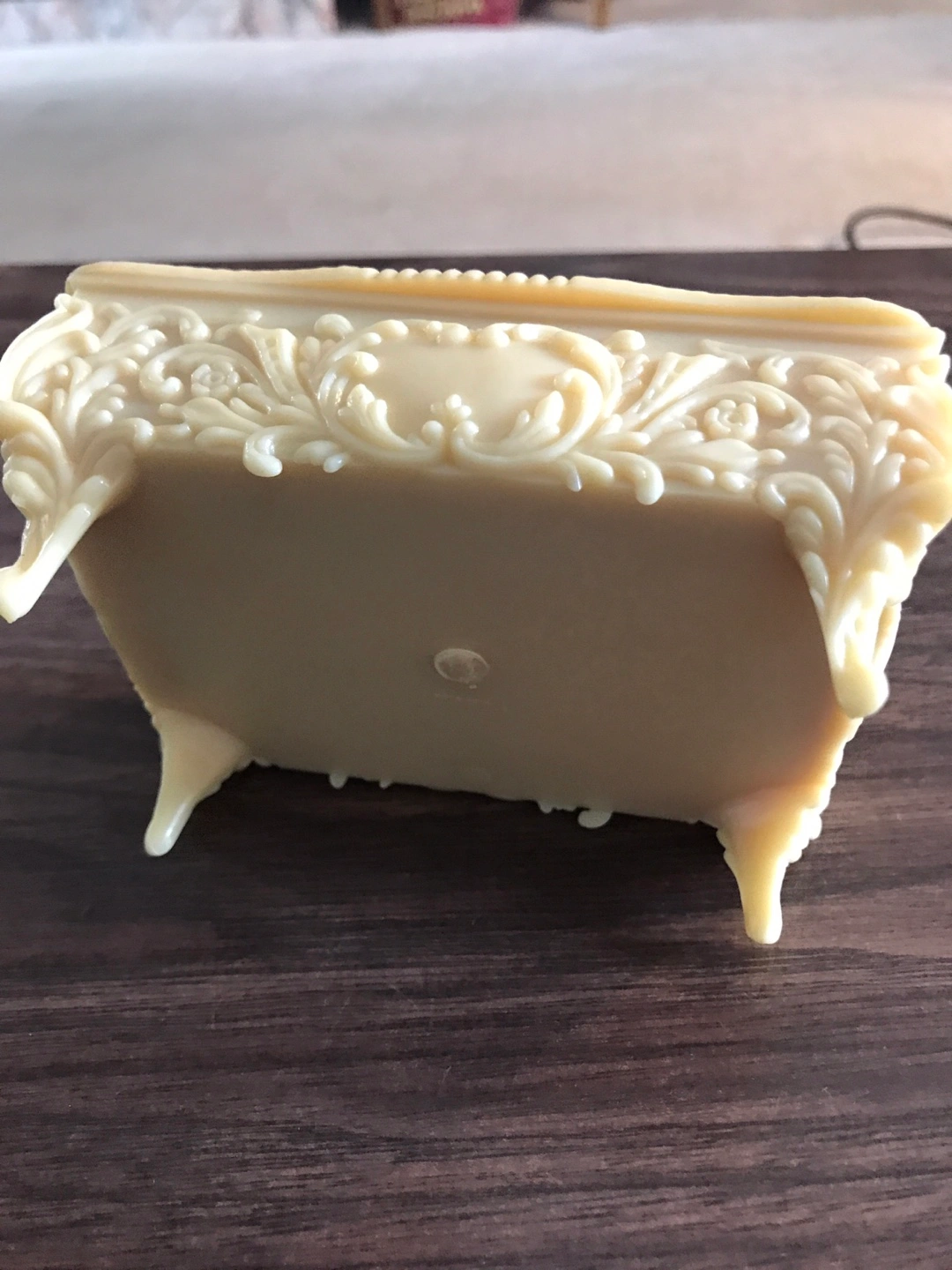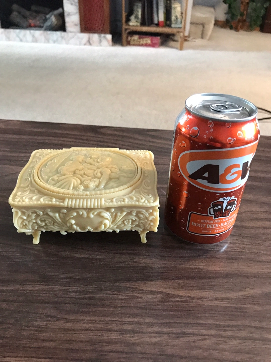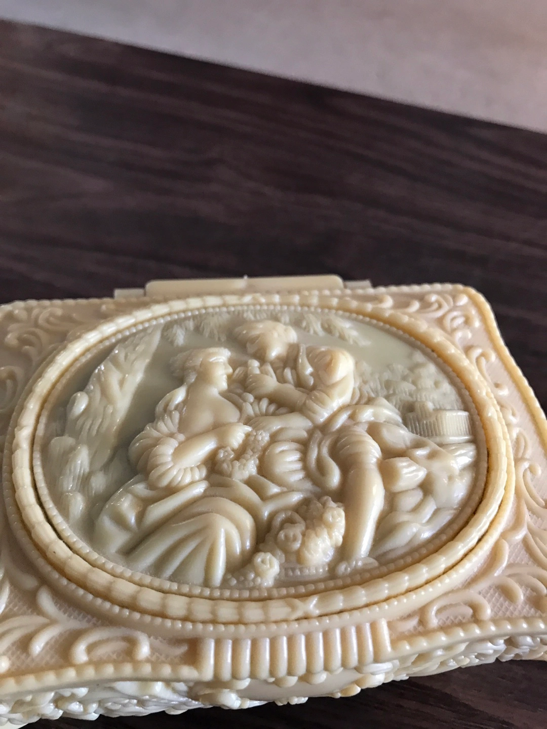 This ornate jewelry box has a classic design with embossed figures on the lid. It features a velvet-lined interior with compartments and a small mirror inside. Great for storing small trinkets or rings! Vintage jewelry box. Made in Hong Kong. 5” long 3 1/4” wide 2 1/4” tall. Not sure what its made of. $15.00