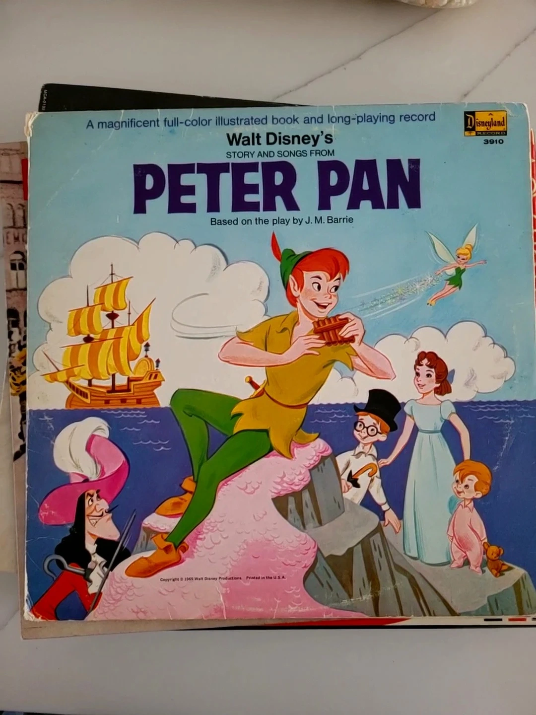 A magnificent full-color illustrated book and long-playing record of Walt Disney's Peter Pan. Based on the play by J. M. Barrie. Copyright 1969. Printed in the U.S.A. this is both the record and a small version of the story to go with it