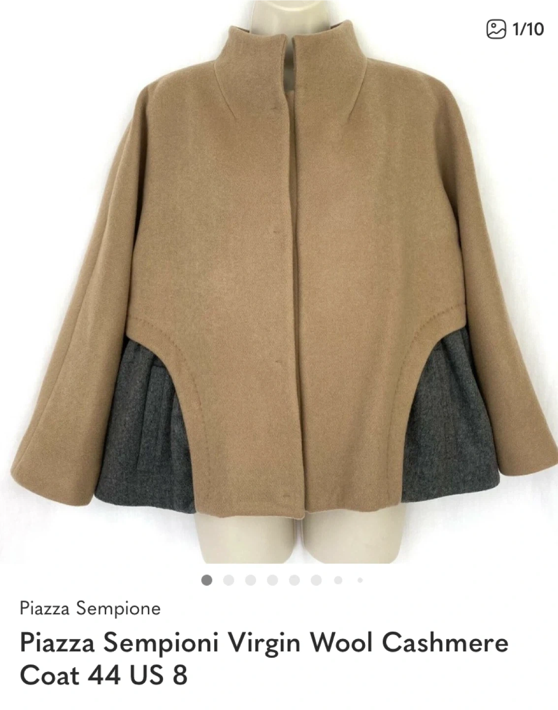 Piazza Sempione coat made from virgin wool and cashmere. This stylish coat features a unique pleated detail at the hem. It's a size 44, which corresponds to a US 8. It's perfect for cooler weather!