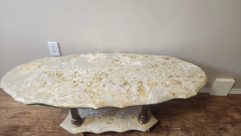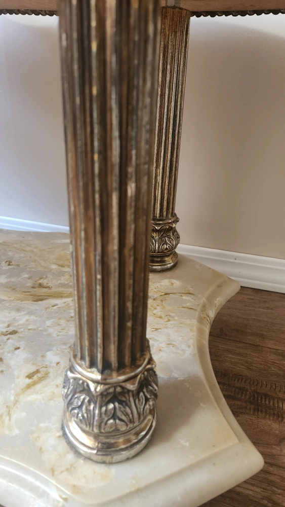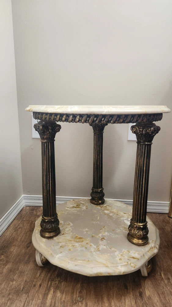 3 Beautiful marble top side table with unique gold-coloured pillar legs! It's in great condition and would add a touch of elegance to any room. Dimensions...large table length 48 inches, height 16 inches and width 20.5 inches
