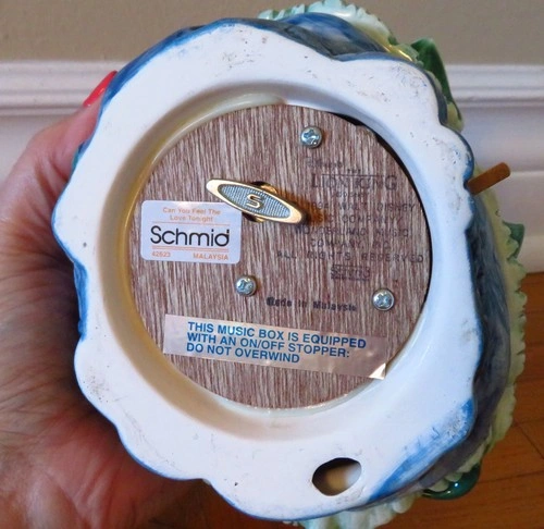 Crafted in 1994 by Schmid, this vintage Disney Lion King music box brings the magic of the beloved franchise to your collection. Featuring the sweet portrayal of Simba and Nala, it beautifully plays the tune "Can You Feel The Love Tonight," accompanied by the timeless charm of Disney craftsmanship. With a height of 6 inches, this porcelain piece makes a harmonious addition to any Disney enthusiast's assemblage. The music box serves as a nostalgic keepsake, capturing the essence of the Lion King's iconic melodies and the enduring legacy of Disney's storytelling. Please check the pictures. There is 1 chip on the grass leaf.