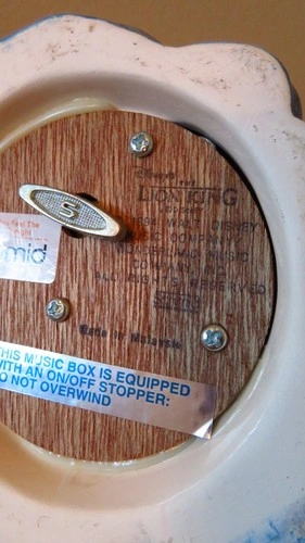 Crafted in 1994 by Schmid, this vintage Disney Lion King music box brings the magic of the beloved franchise to your collection. Featuring the sweet portrayal of Simba and Nala, it beautifully plays the tune "Can You Feel The Love Tonight," accompanied by the timeless charm of Disney craftsmanship. With a height of 6 inches, this porcelain piece makes a harmonious addition to any Disney enthusiast's assemblage. The music box serves as a nostalgic keepsake, capturing the essence of the Lion King's iconic melodies and the enduring legacy of Disney's storytelling. Please check the pictures. There is 1 chip on the grass leaf.
